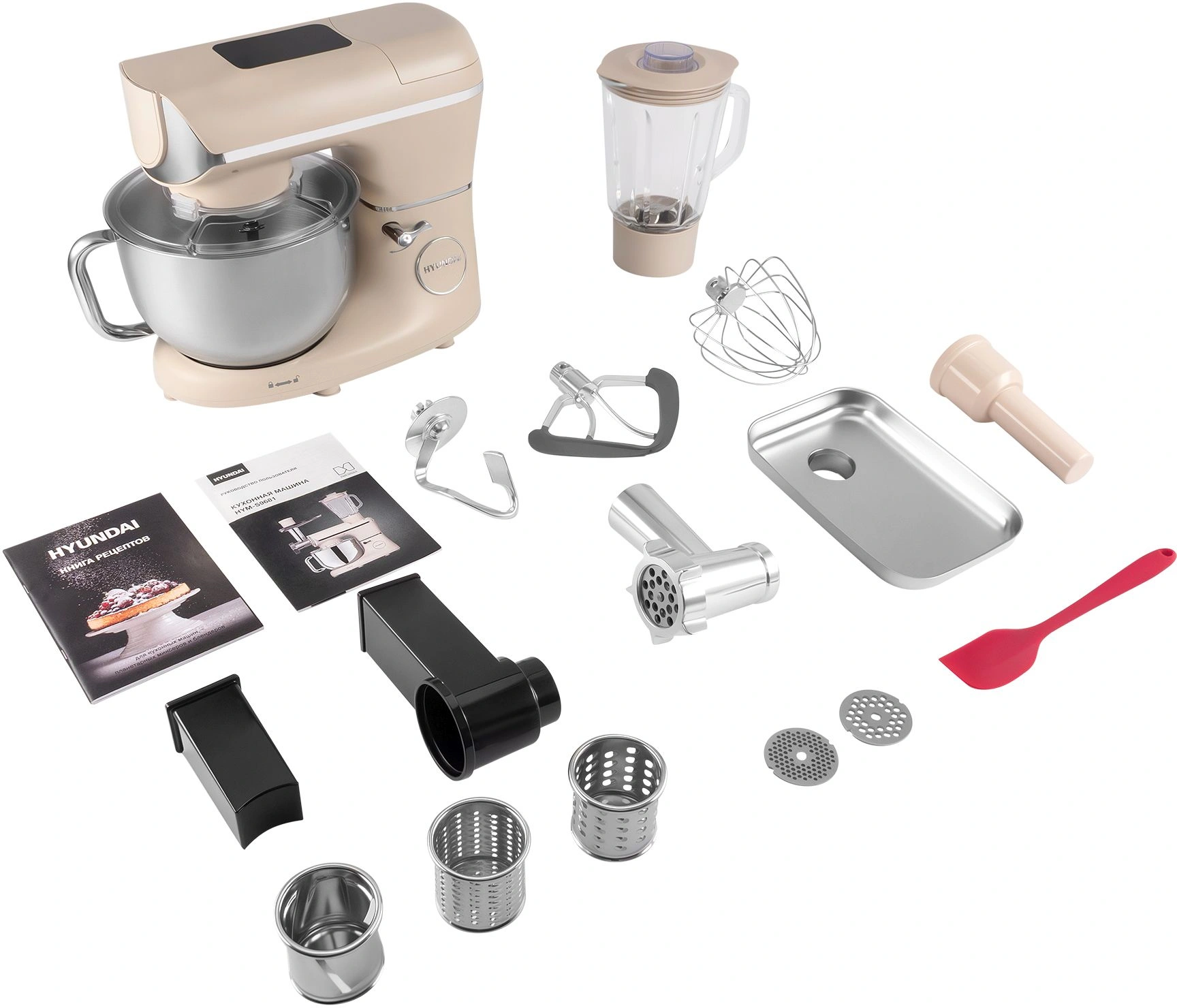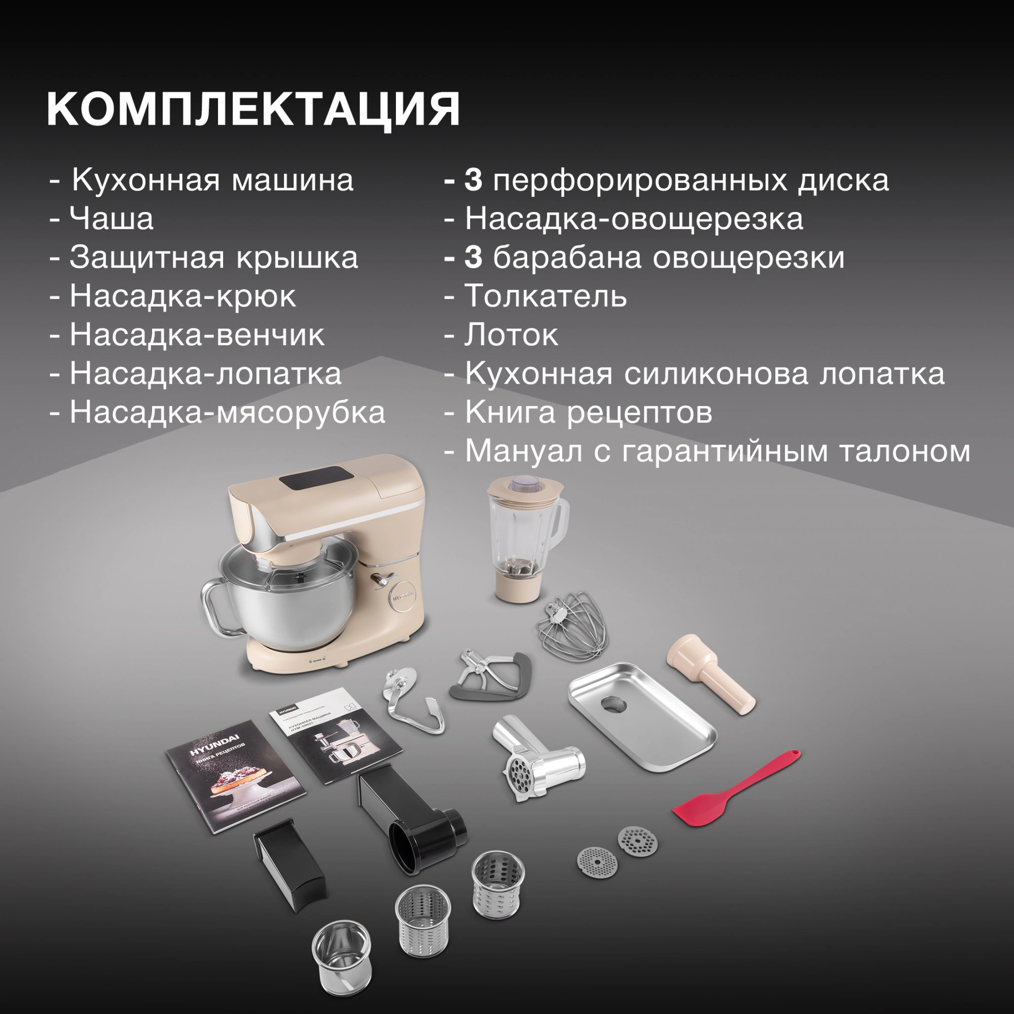 кухонная машина; чаша; защитная крышка для чаши; насадка-венчик; насадка-крюк; насадка-лопатка; насадка-блендер; насадка-мясорубка; 3 диска для фраша; насадка-овощерезка; книга рецептов; инструкция с гарантийным талоном