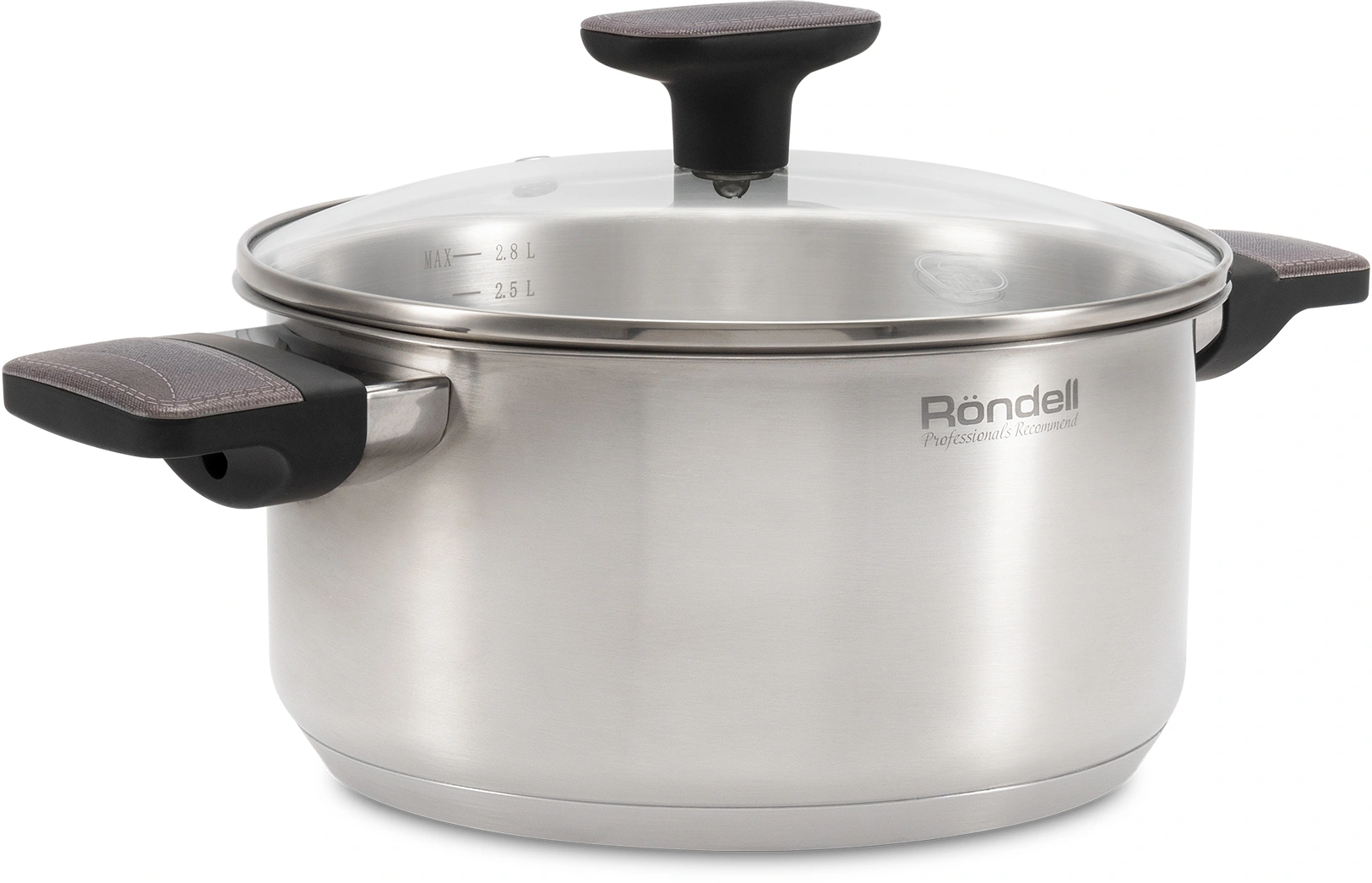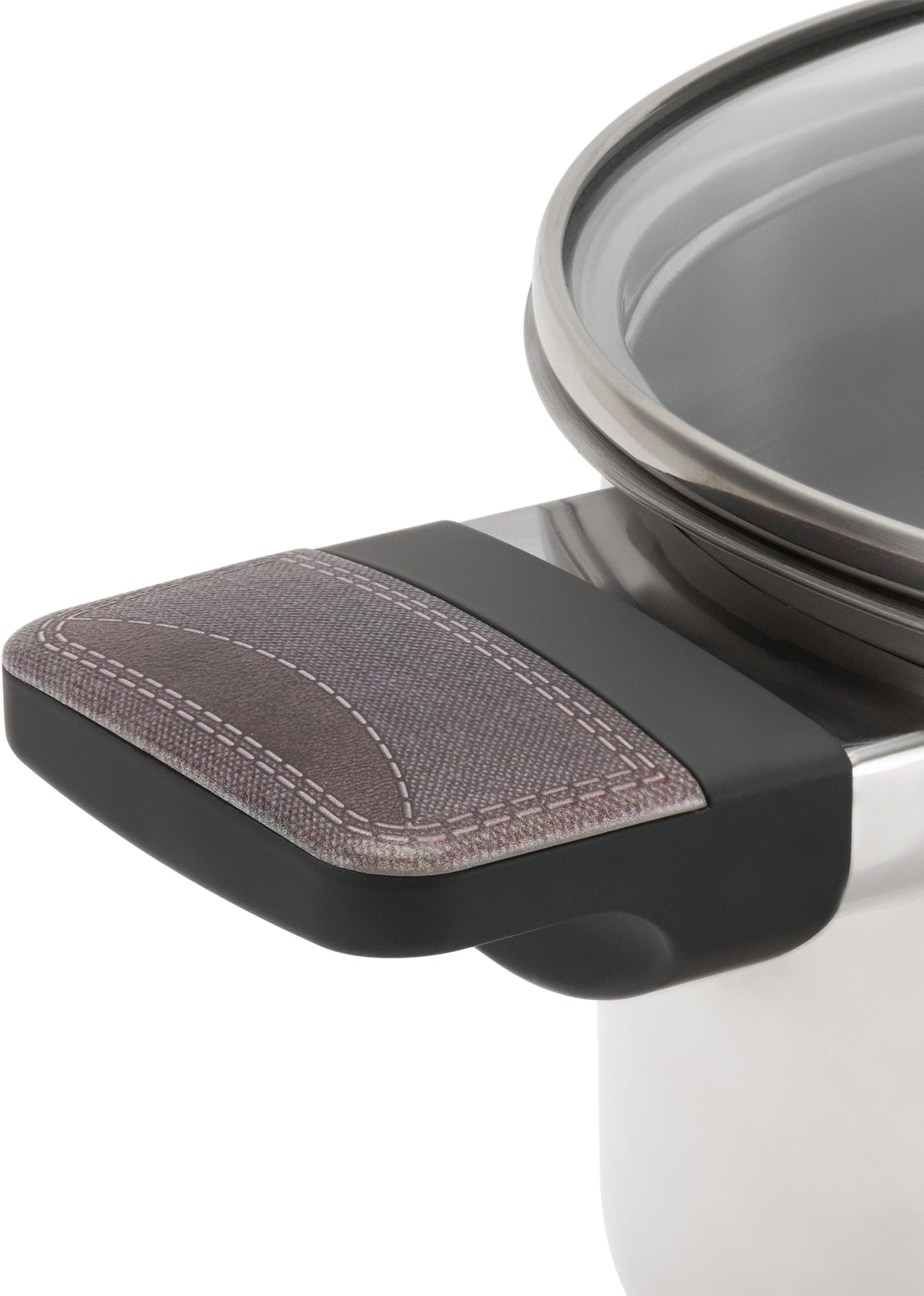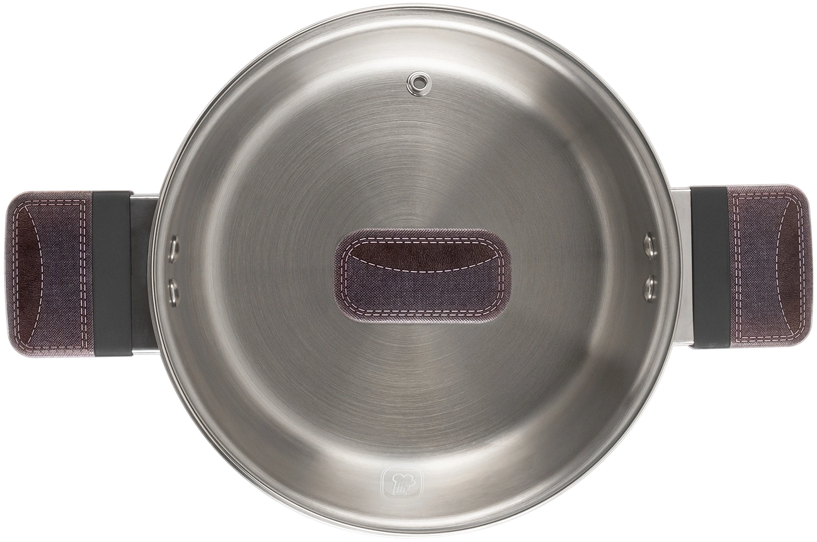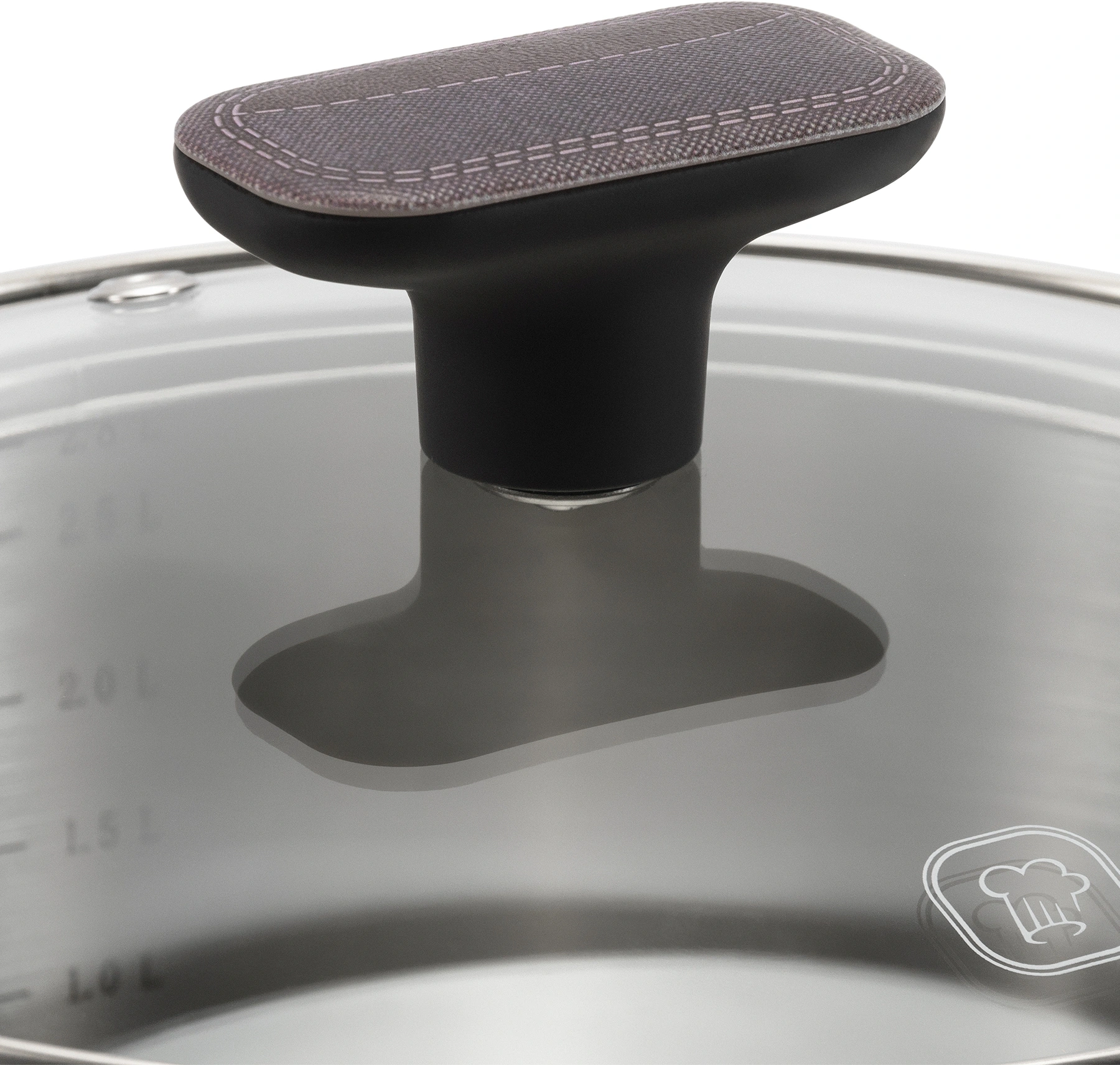 Нерж.сталь 18/10 - 0,6 мм. Технология: тройное вштампованное, а затем вплавленное дно без воздушных полостей. Аксессуары - бакелит soft touch и ABS декоративной вставкой. Прямые стенки корпуса. Крышка из термостойкого стекла с металлическим ободом.