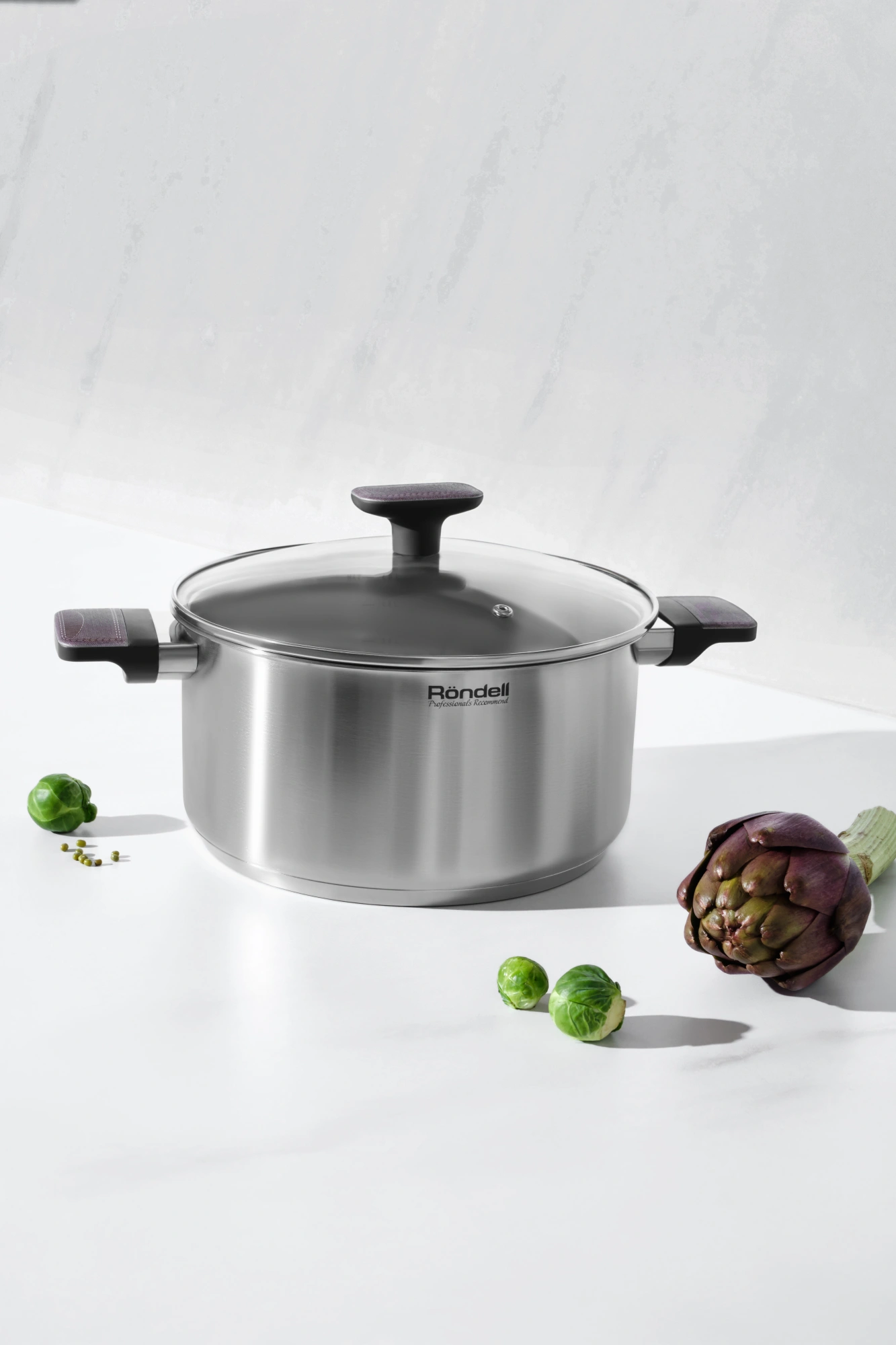 Нерж.сталь 18/10 - 0,6 мм. Технология: тройное вштампованное, а затем вплавленное дно без воздушных полостей. Аксессуары - бакелит soft touch и ABS декоративной вставкой. Прямые стенки корпуса. Крышка из термостойкого стекла с металлическим ободом.