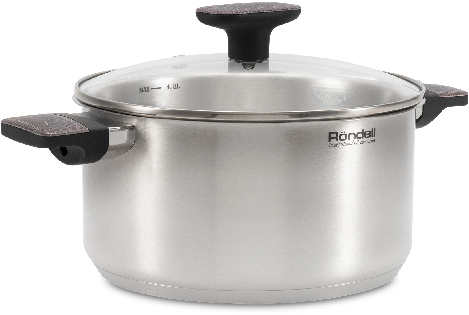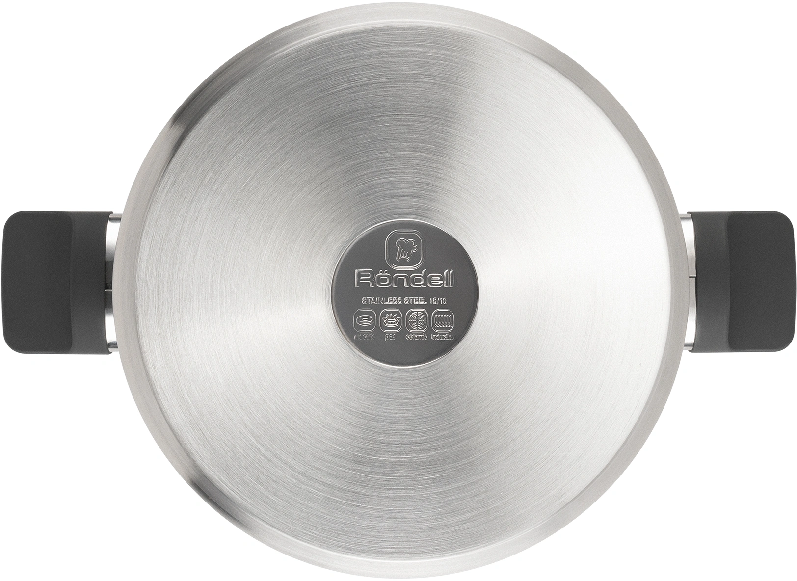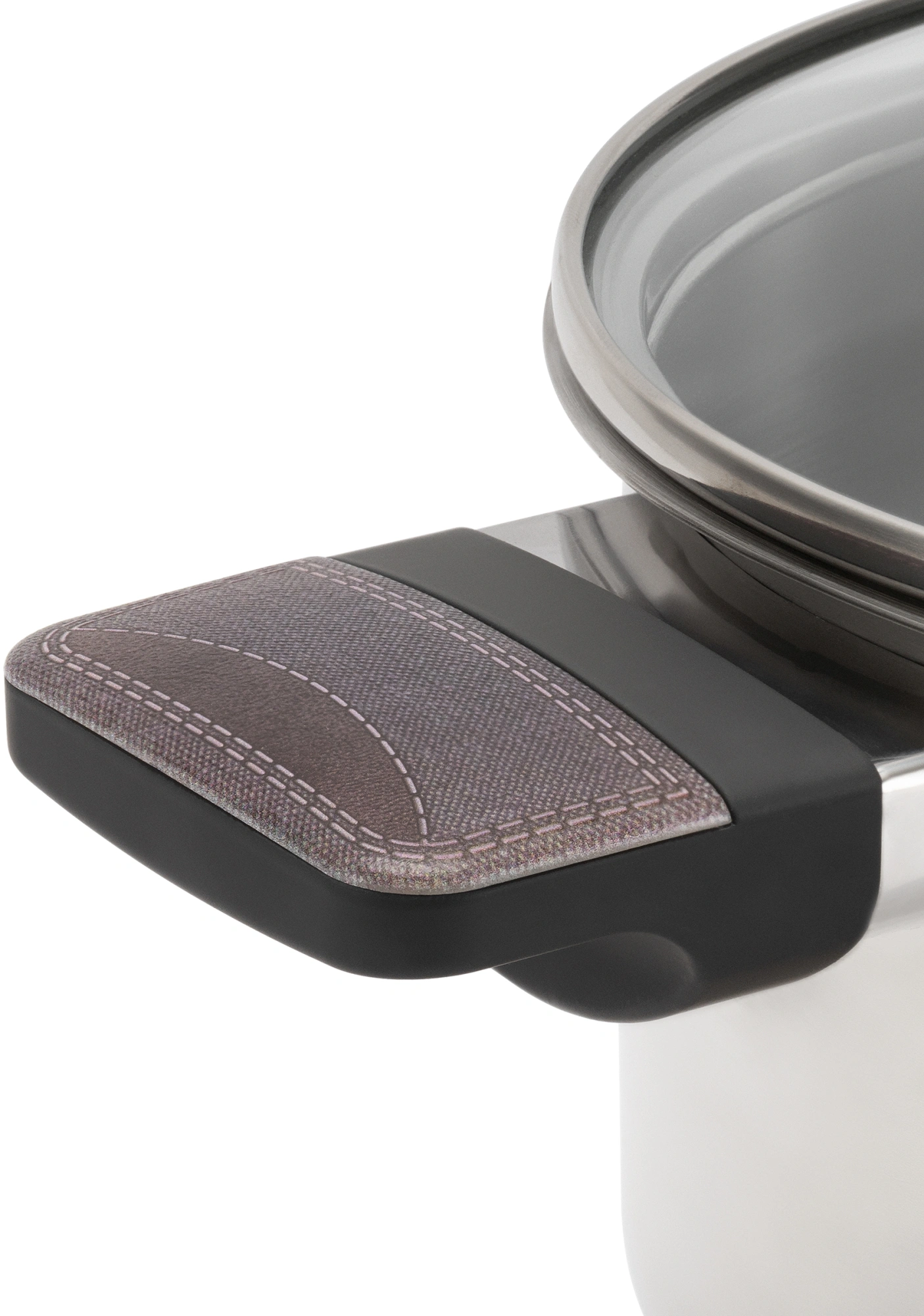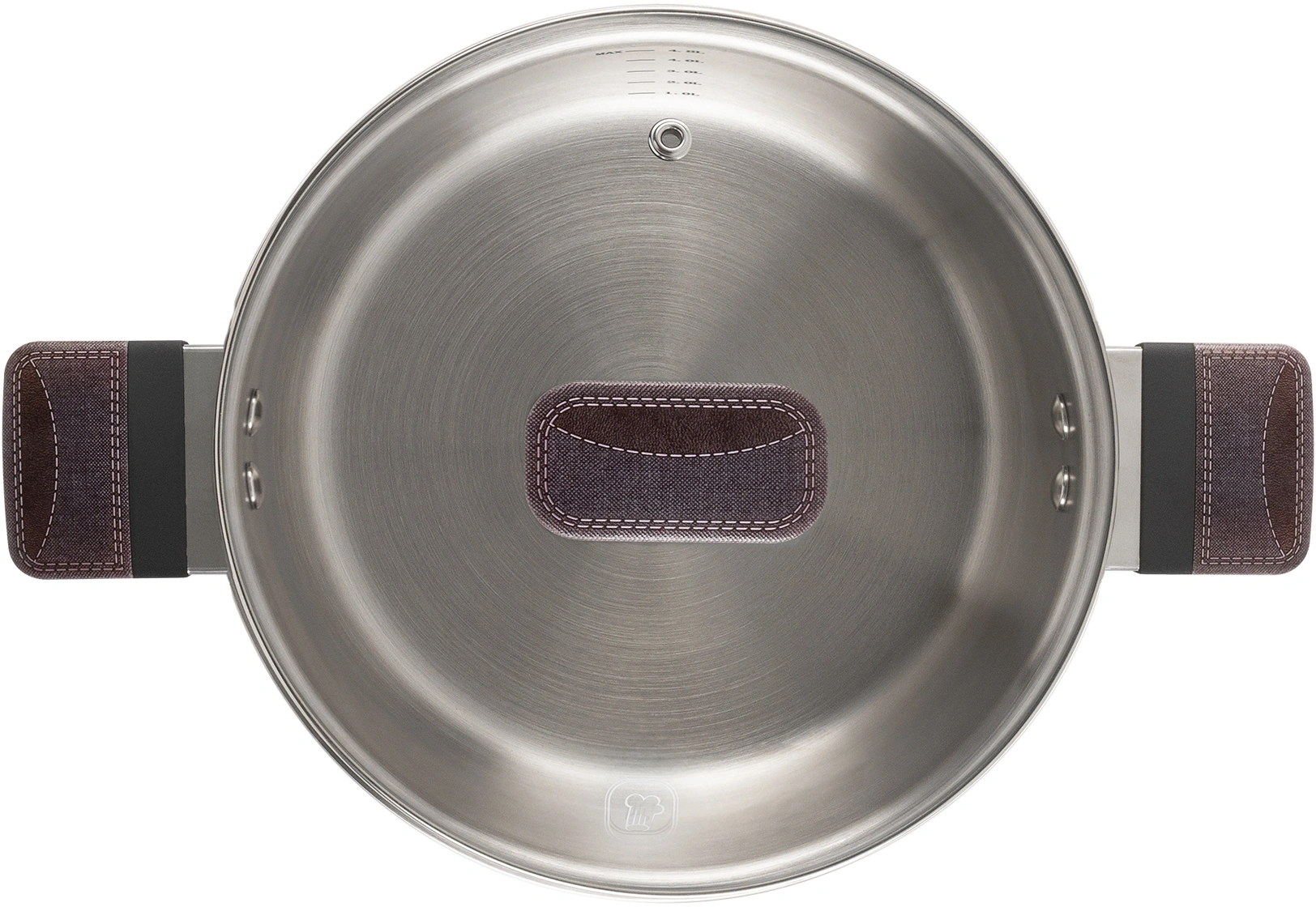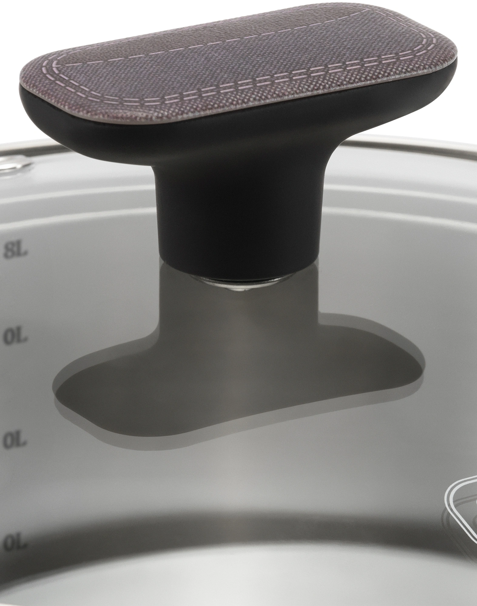Нерж.сталь 18/10 - 0,6 мм. Технология: тройное вштампованное, а затем вплавленное дно без воздушных полостей. Аксессуары - бакелит soft touch и ABS декоративной вставкой. Прямые стенки корпуса. Крышка из термостойкого стекла с металлическим ободом.