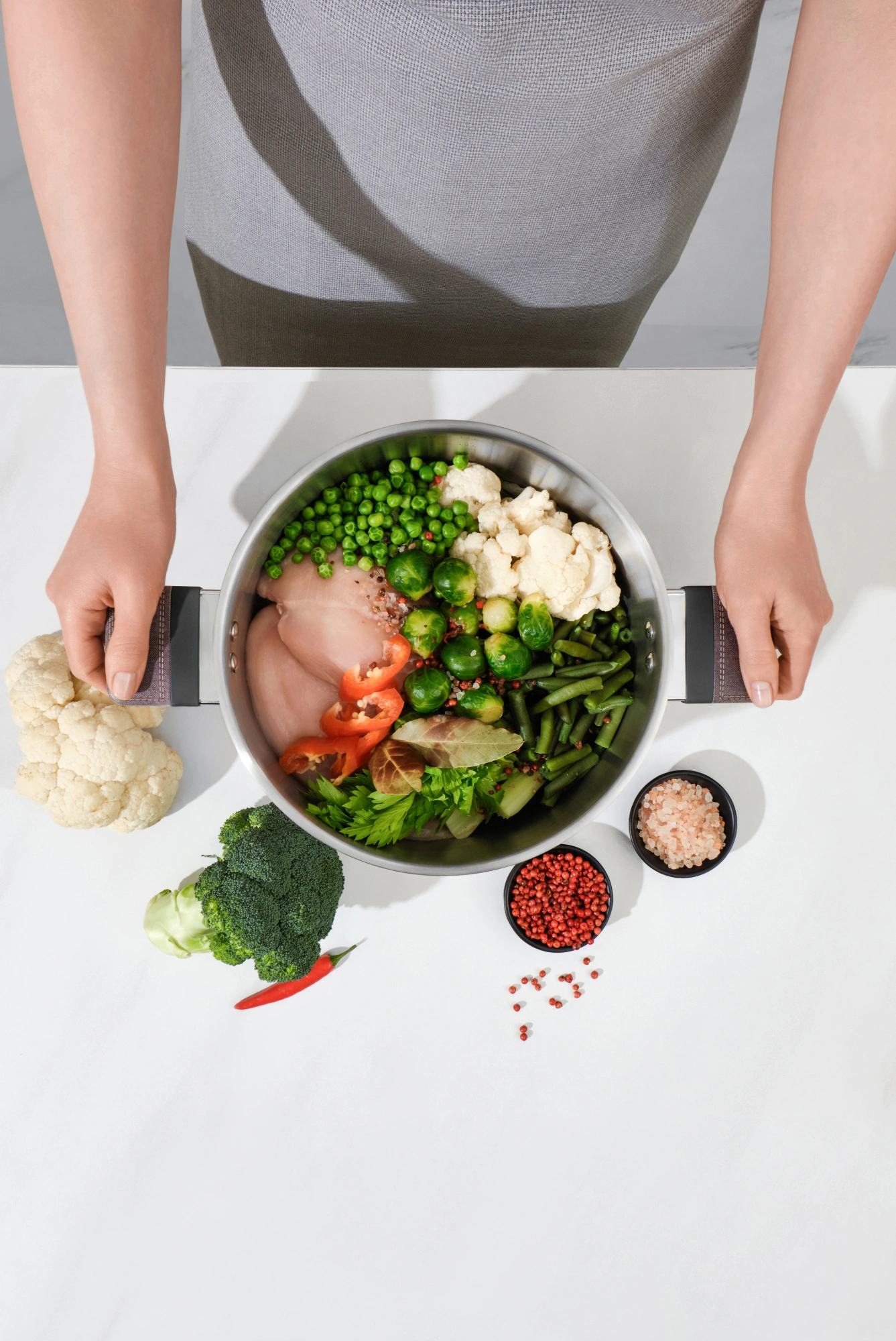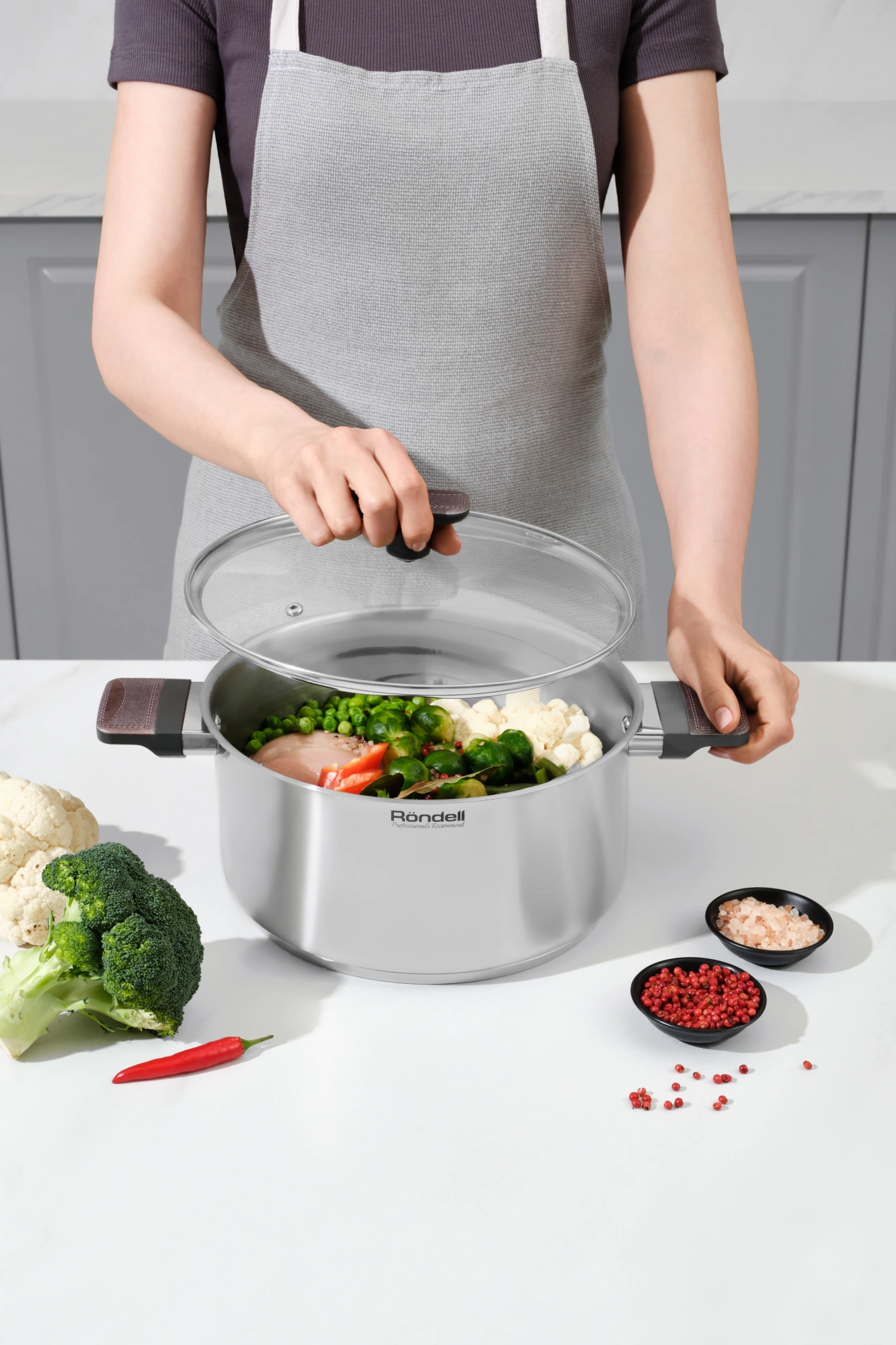 Нерж.сталь 18/10 - 0,6 мм. Технология: тройное вштампованное, а затем вплавленное дно без воздушных полостей. Аксессуары - бакелит soft touch и ABS декоративной вставкой. Прямые стенки корпуса. Крышка из термостойкого стекла с металлическим ободом.