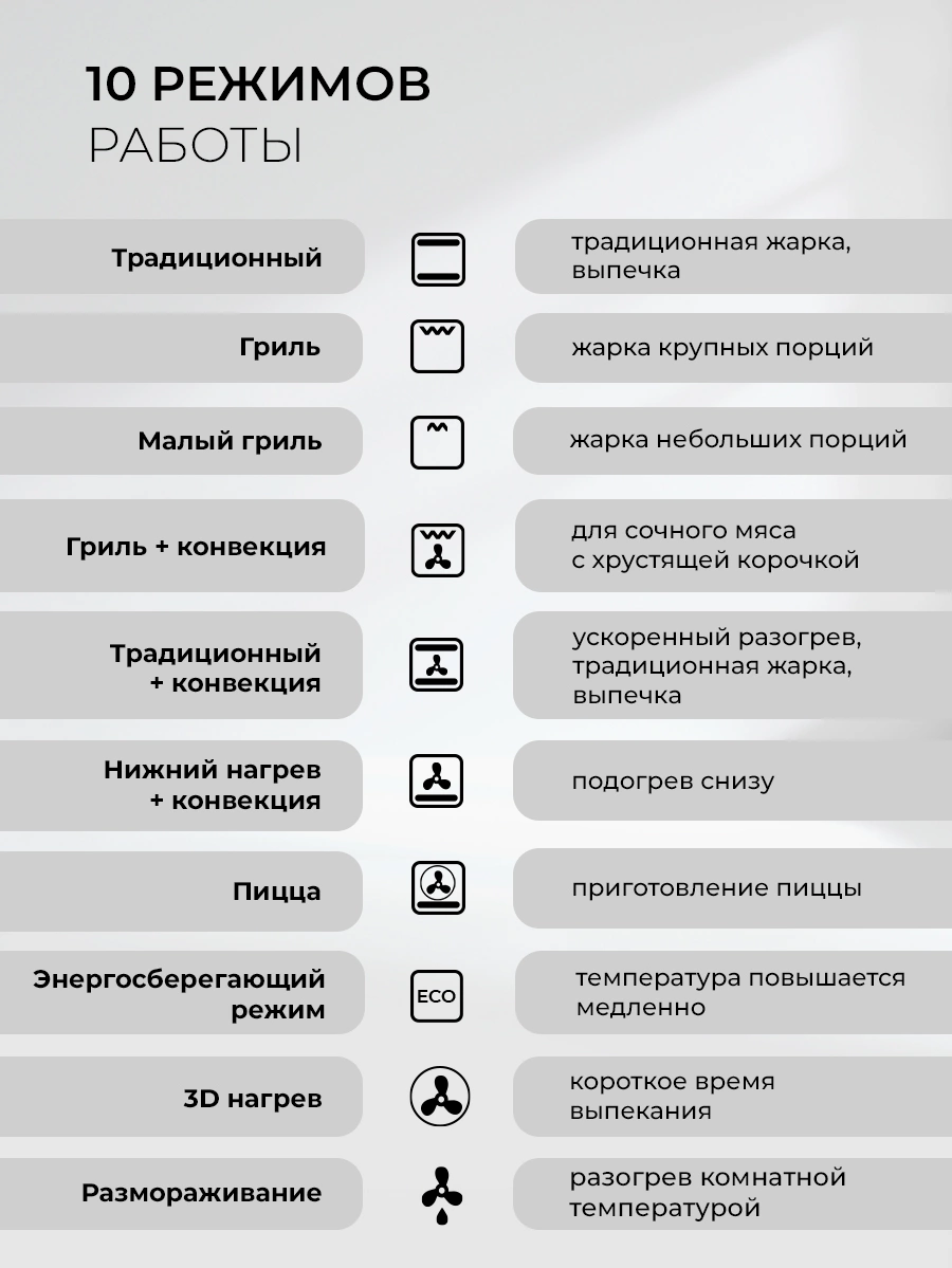 гриль, конвекция, размораживание