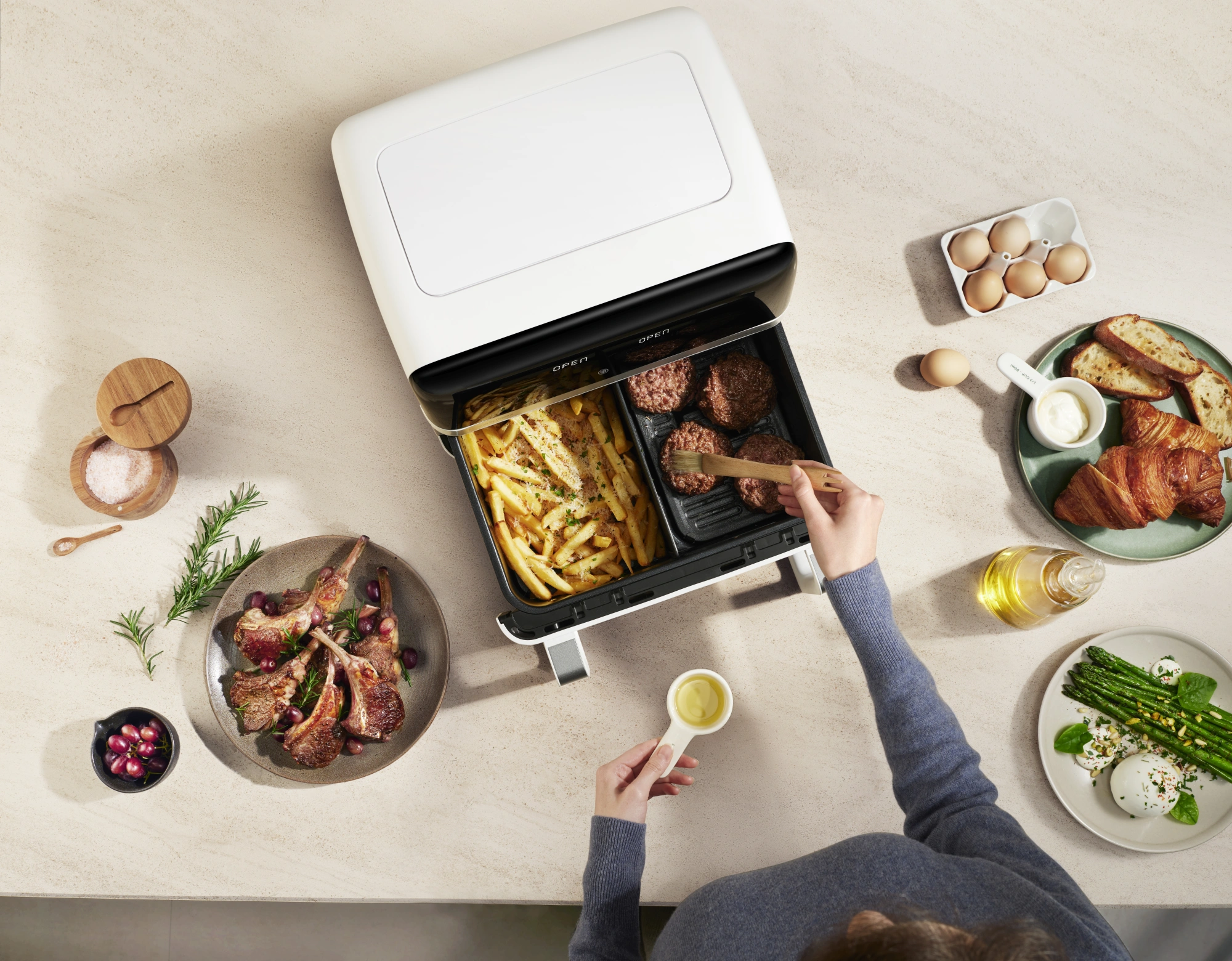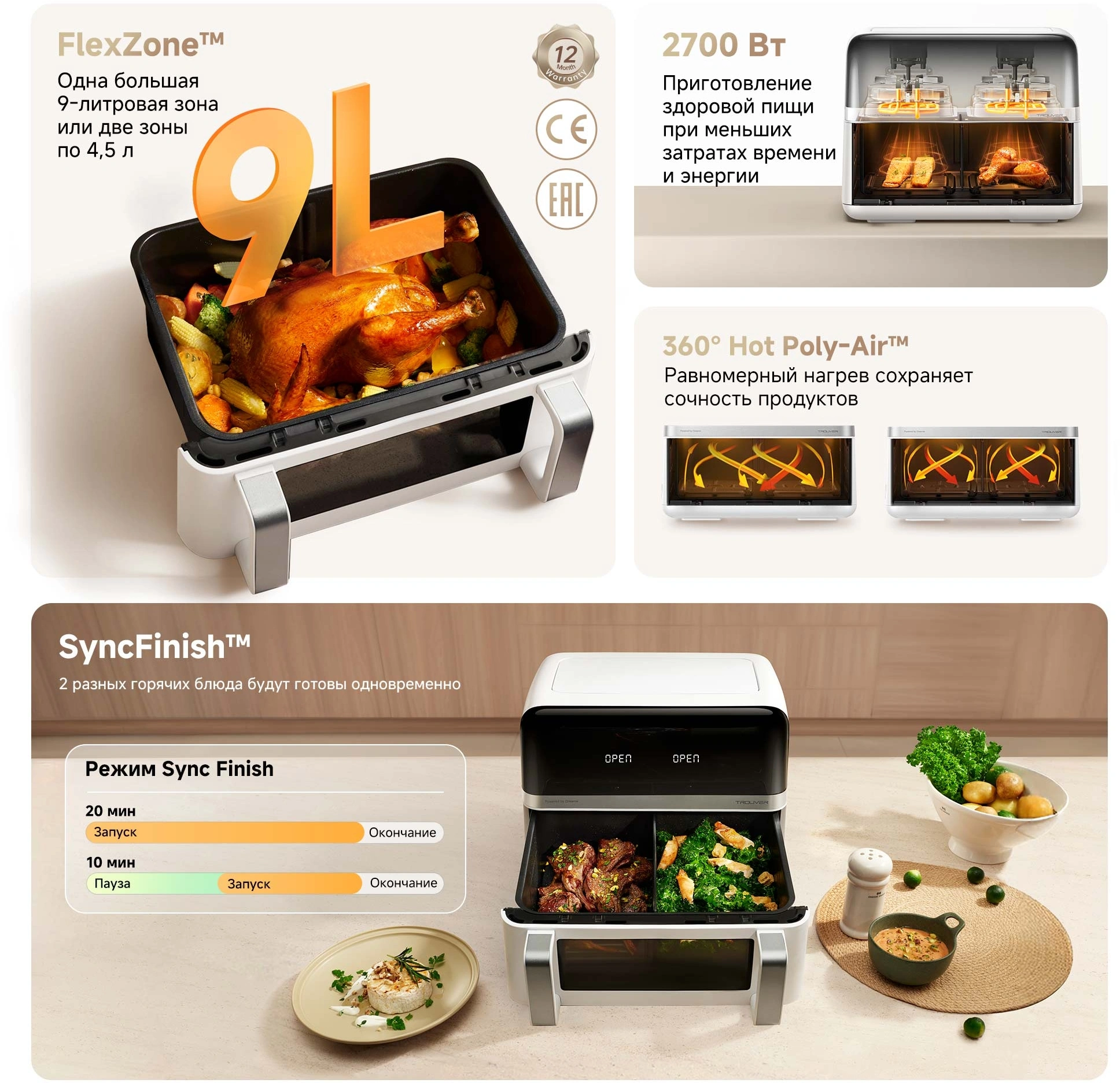 Гибкая система из двух зон, переключение на одну большую зону приготовления. Две независимые системы нагрева. Цельнометаллический внутренний корпус позволяет избежать запаха пластика во время нагрева.