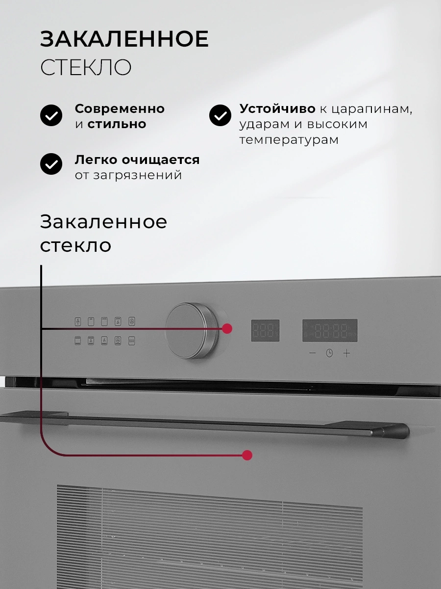 вентилятор охлаждения, дисплей, полностью стеклянная внутренняя поверхность дверцы духовки, телескопические направляющие