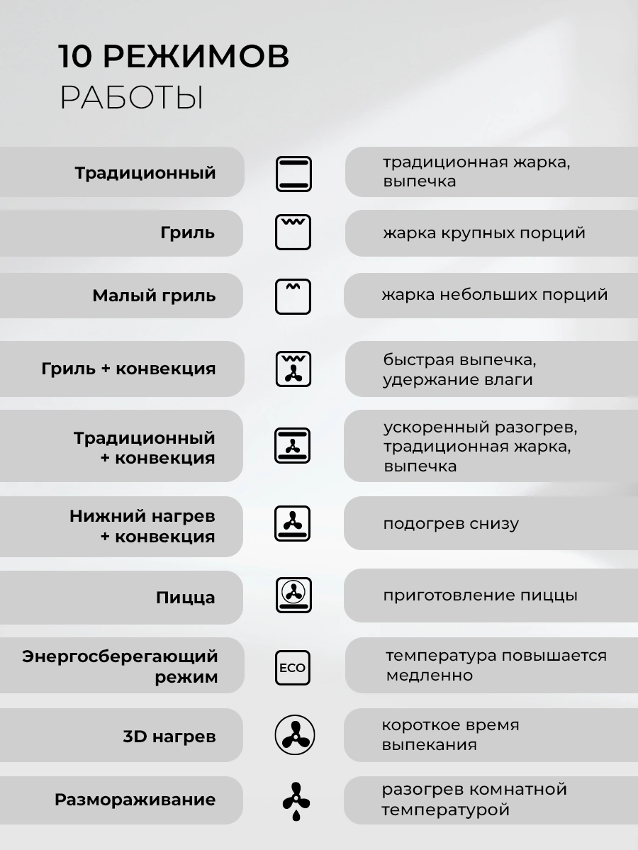 гриль, конвекция, размораживание
