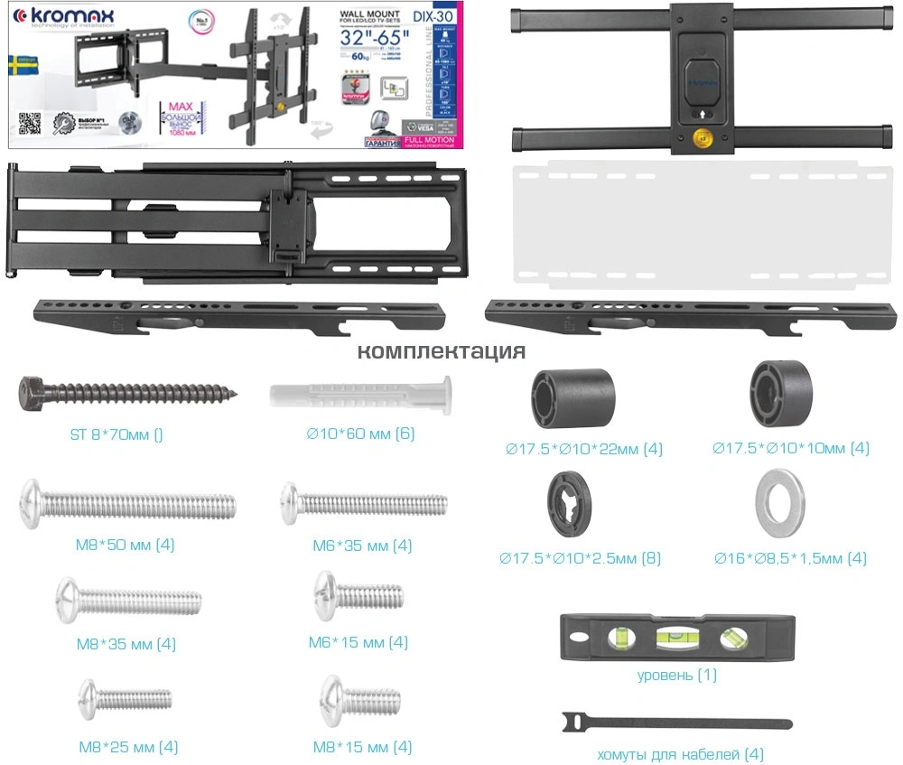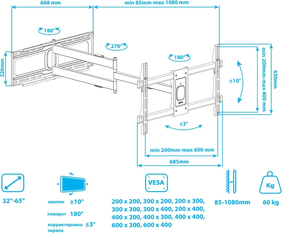 черный 32"-65" макс.60кг настенный поворот и накло...