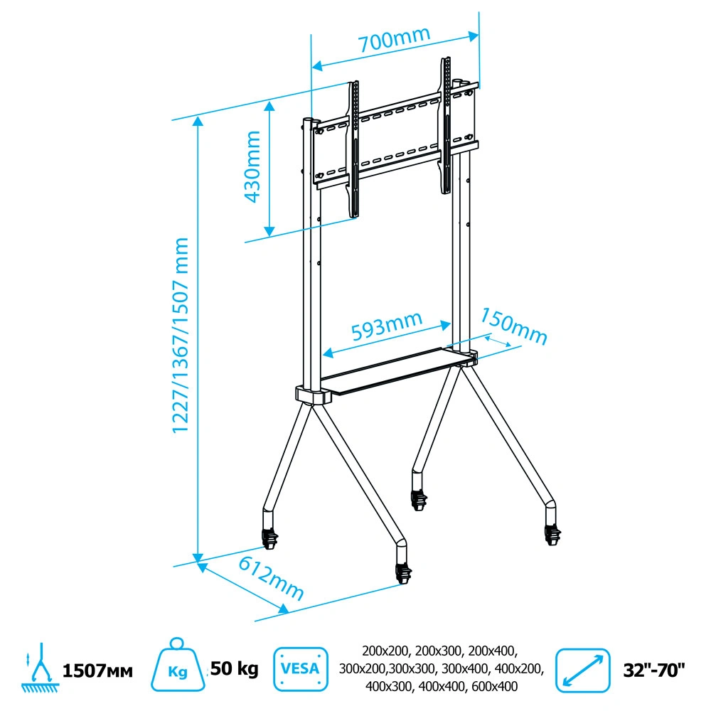 Мощная конструкция мобильной стойки позволяет надёжно удерживать дорогостоящее оборудование, а поворотные колеса с фиксирующим механизмом дают возможность плавно перемещать стойку в нужное вам место.