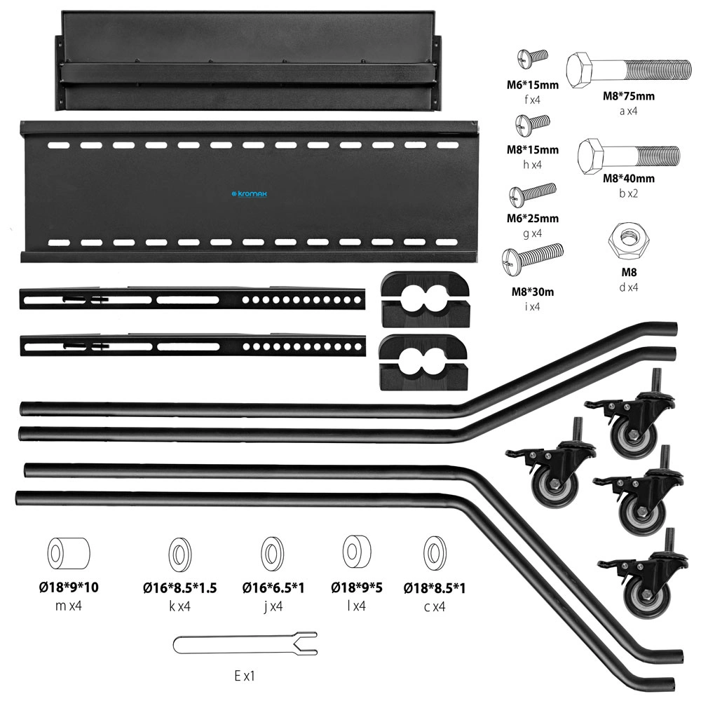 Мобильная стойка для телевизора, комплект ключей и крепежа для установки ТВ, навесной уровень, инструкция на русском языке.