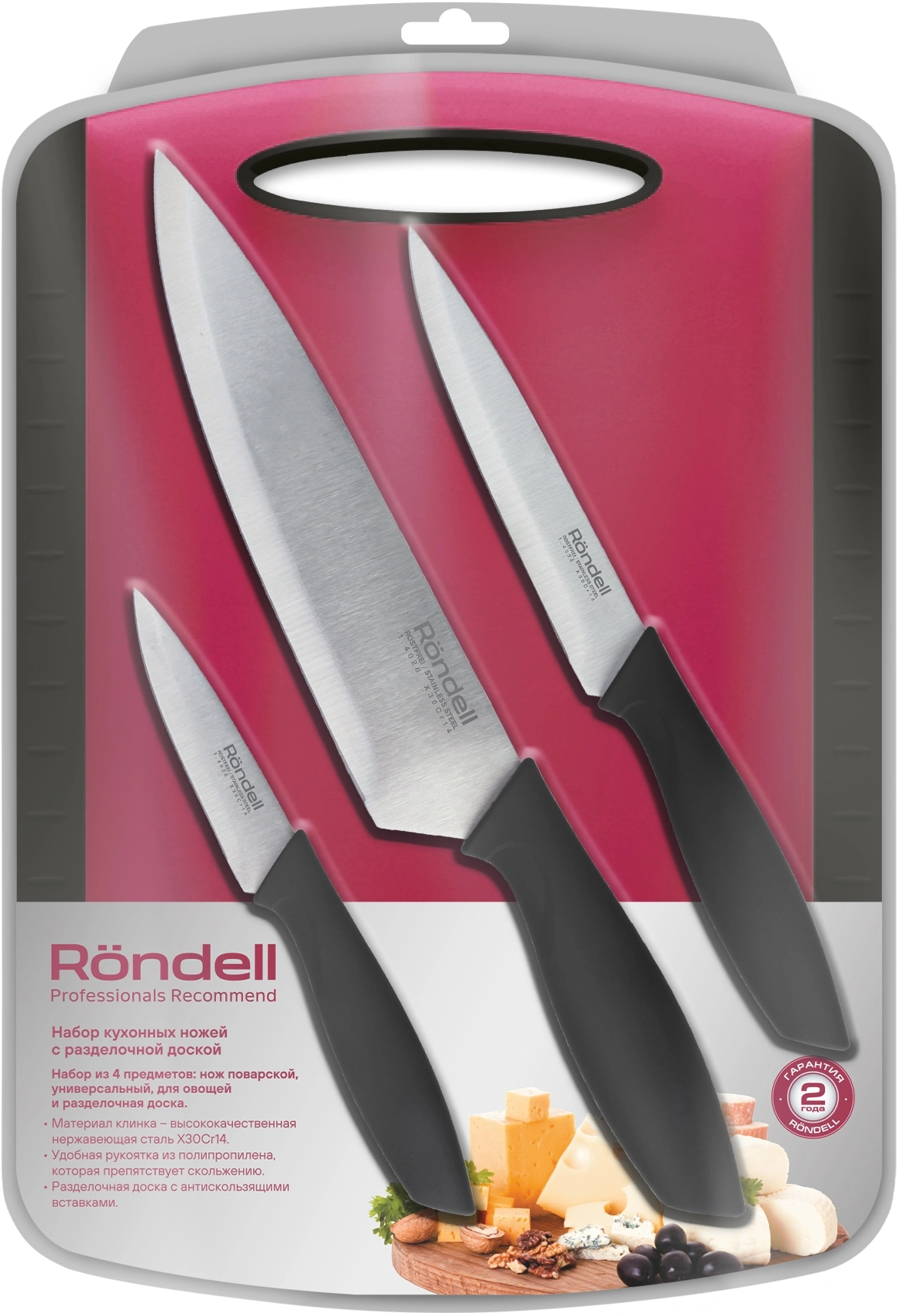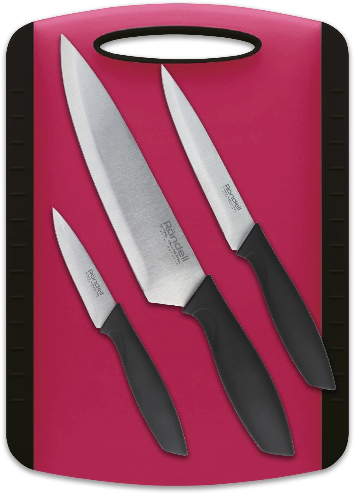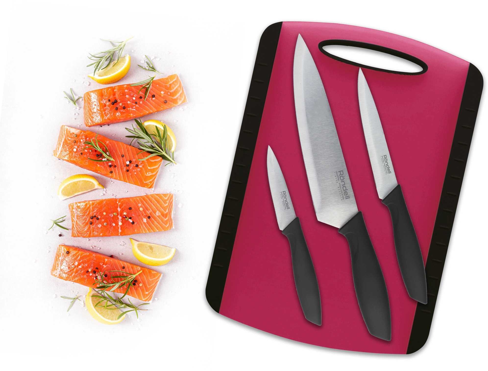 Материал клинка: высококачественная нержавеющая сталь X30Cr14. Материал рукоятки: прорезиненные с удобным хватом, не позволяющим руке скользить. Особенности клинка: двусторонняя заточка лезвий. В комплекте разделочная доска: безопасна - не скользит и приятна на ощупь.