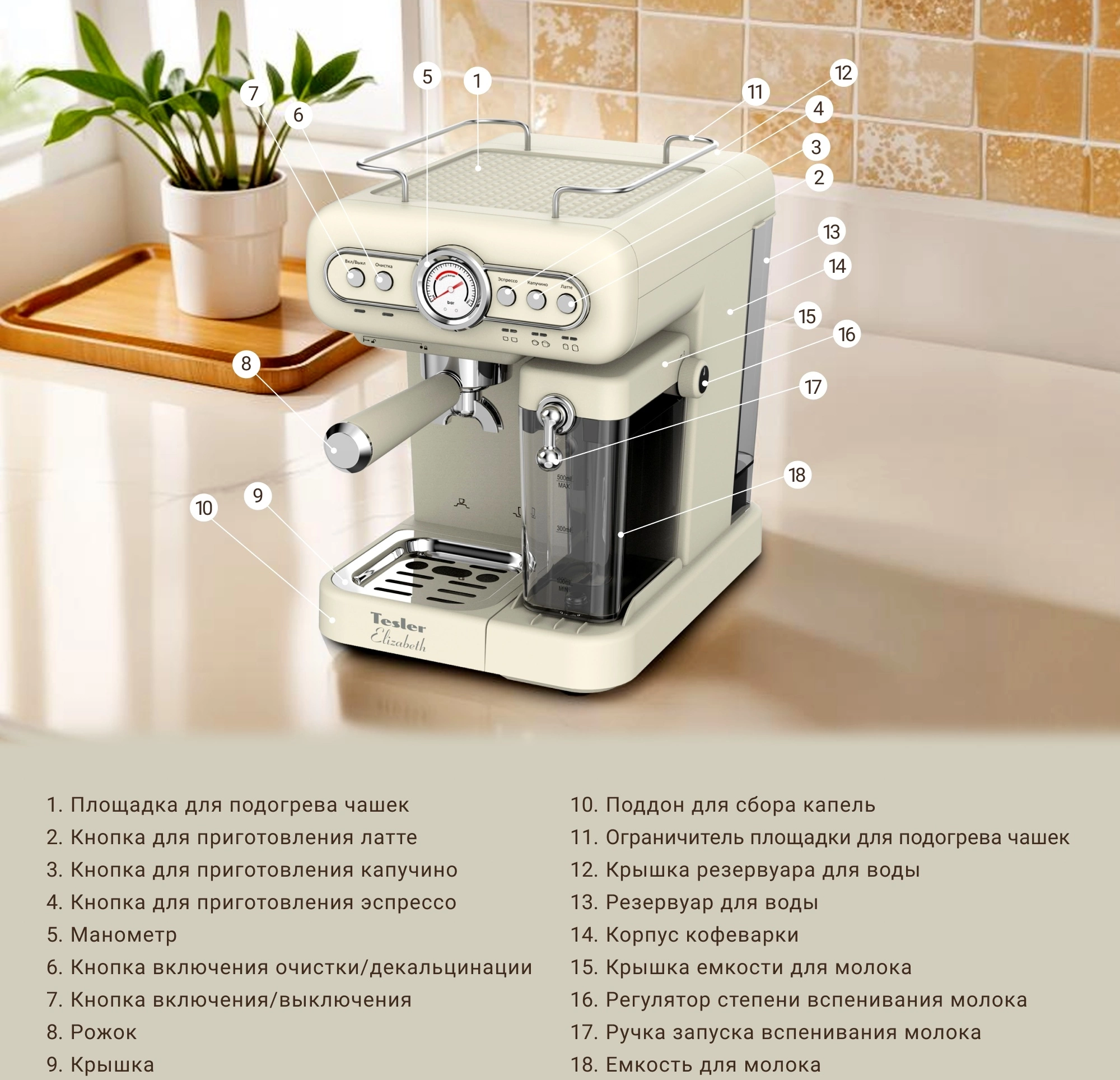 капучинатор, панель для подогрева чашек, съемный дренажный отсек для капель, съемный поддон для капель, съемный резервуар для воды, темпер