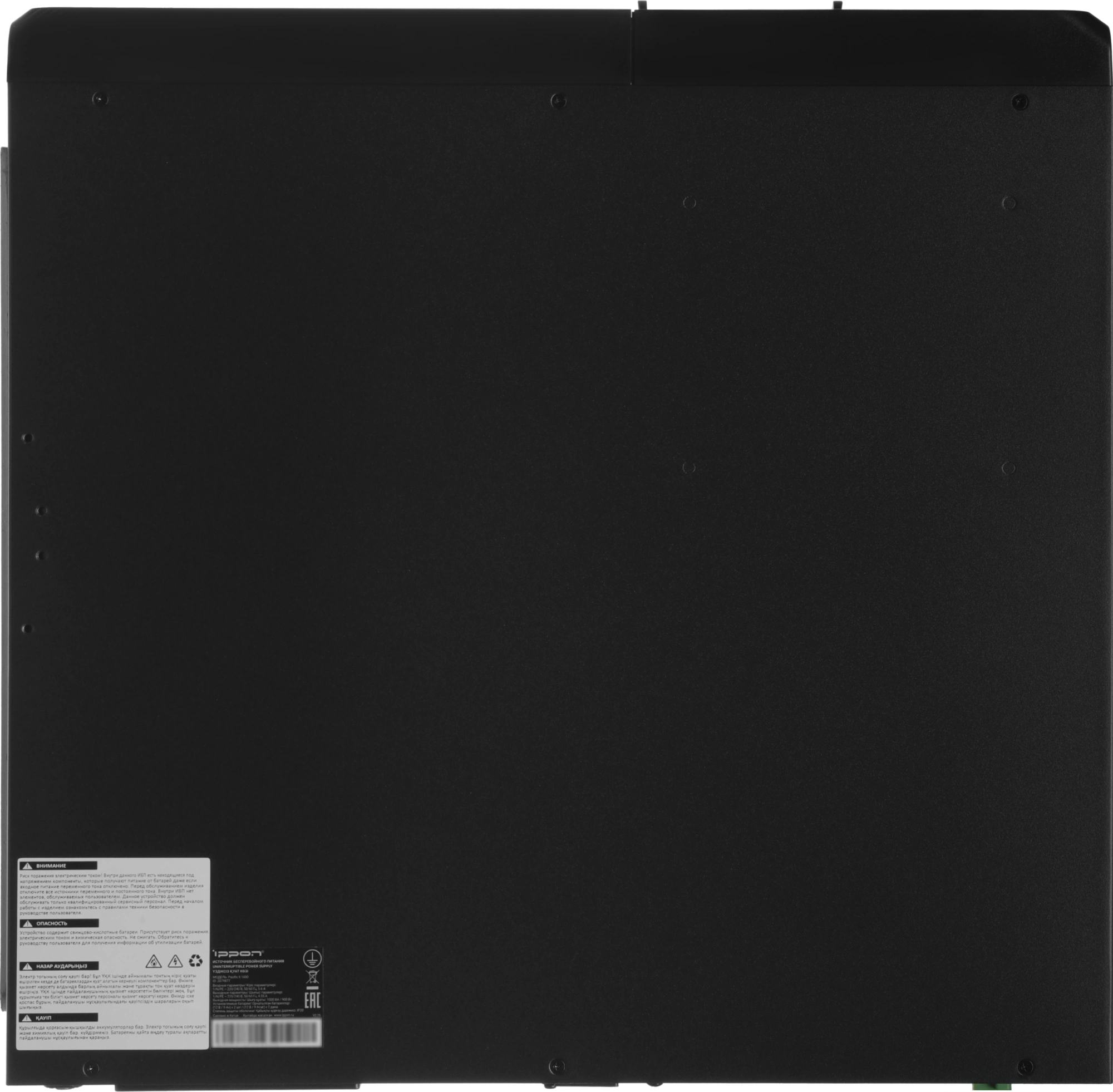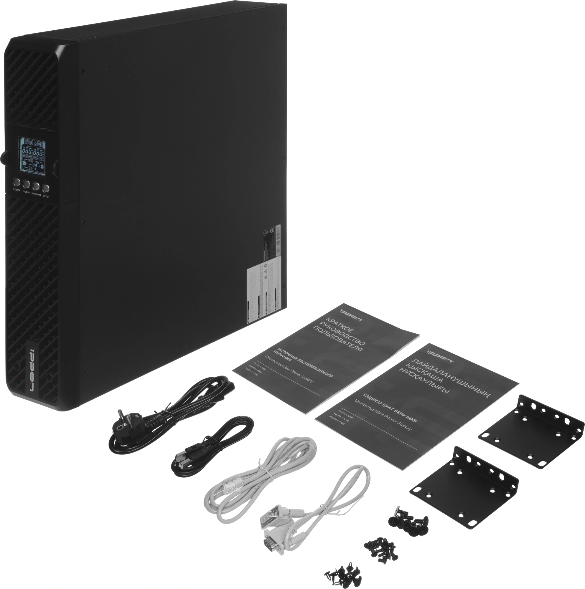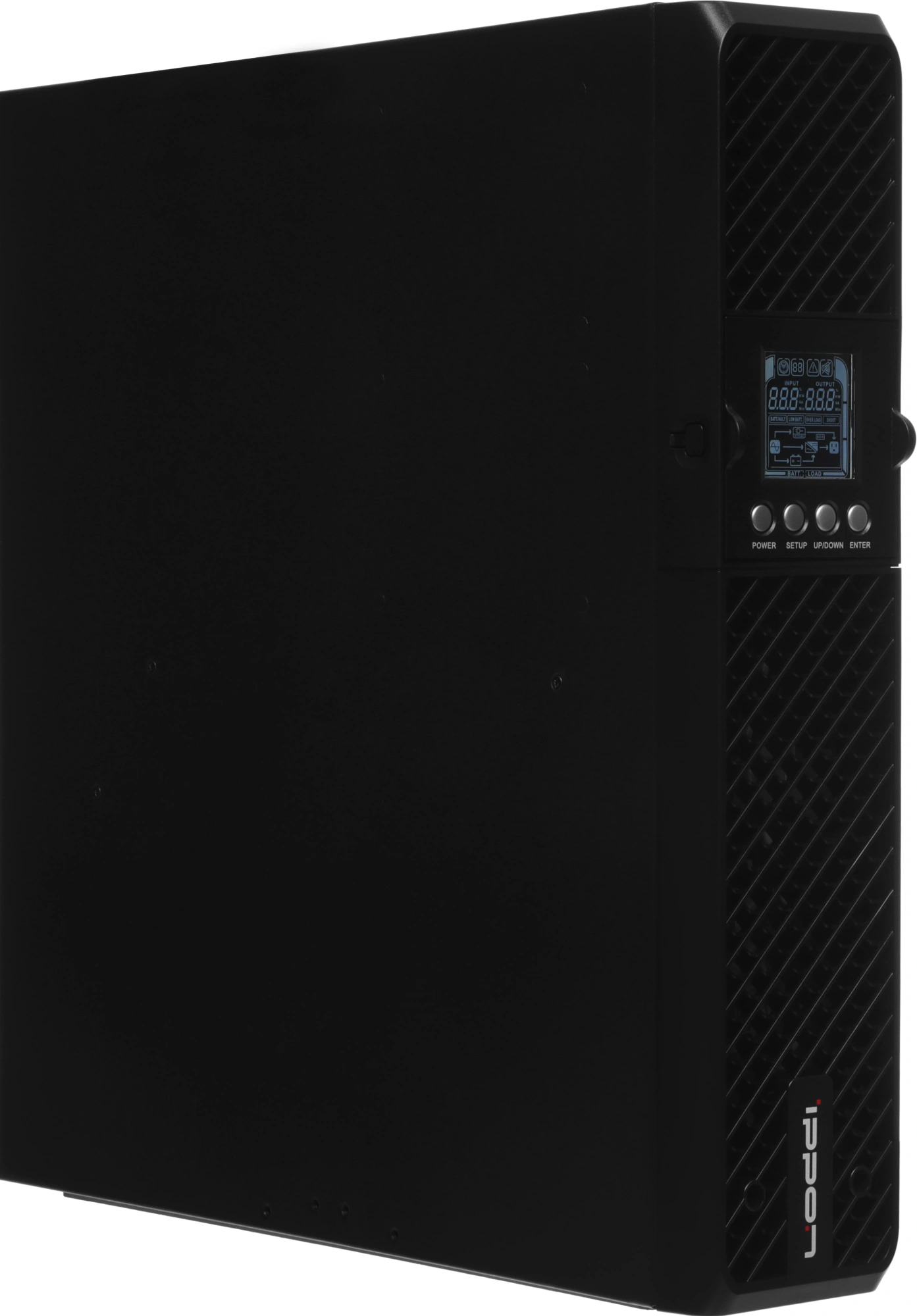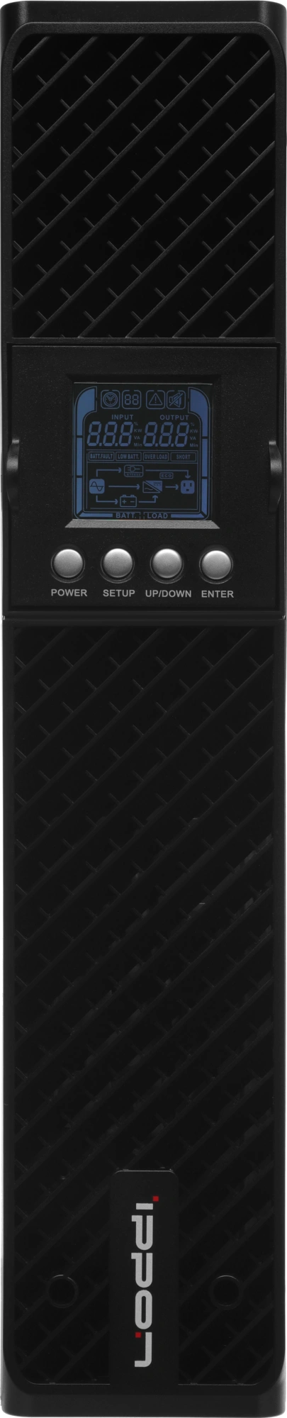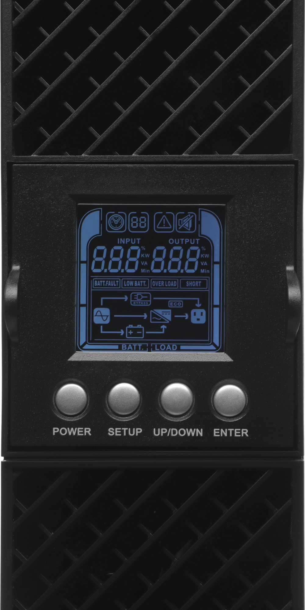 ЖКИ с подсветкой, отображающий цифровую величину входного и выходного напряжения, а также величину нагрузки и остаточной емкости батареи, пиктограммы индикации питания от сети, от батареи, режим регулятора