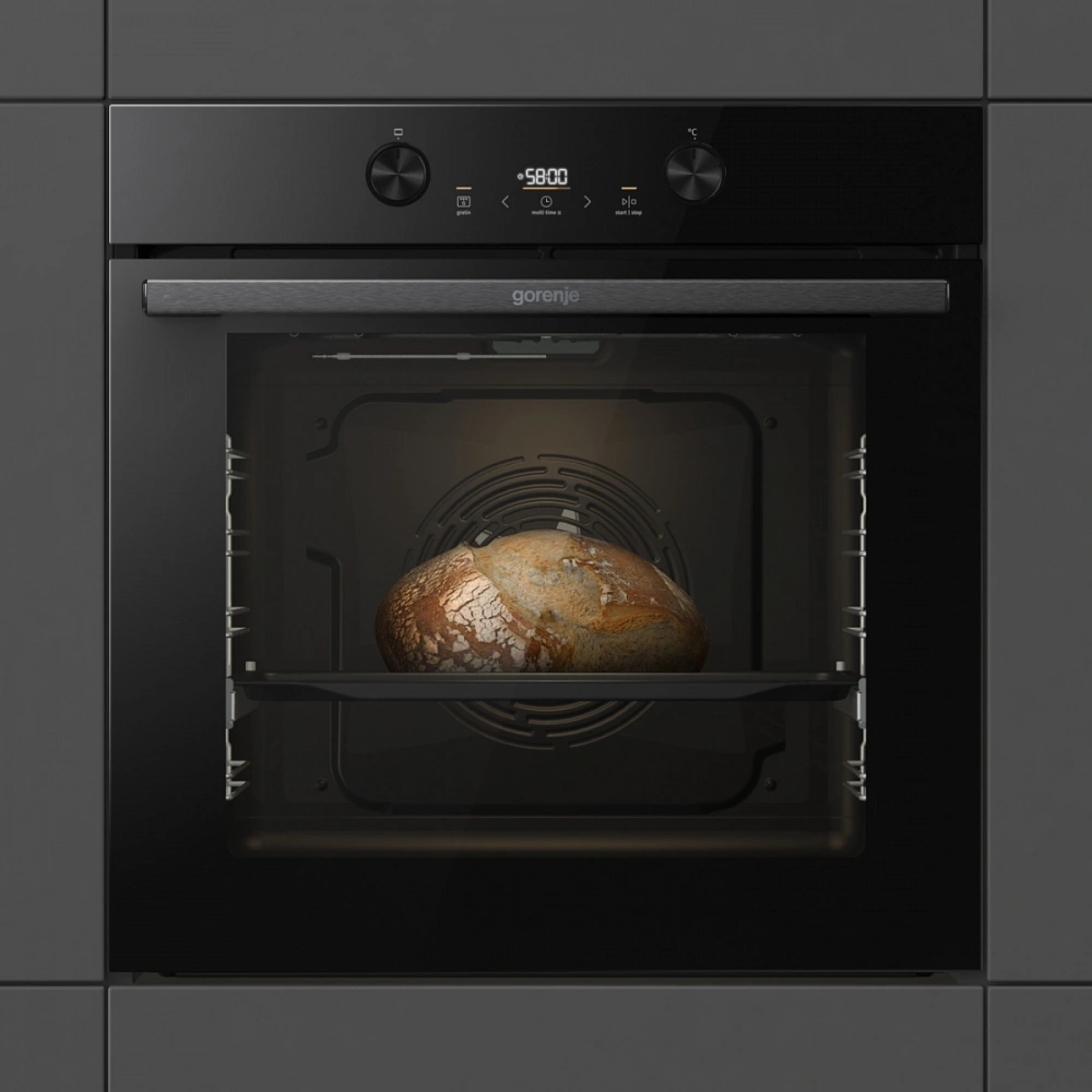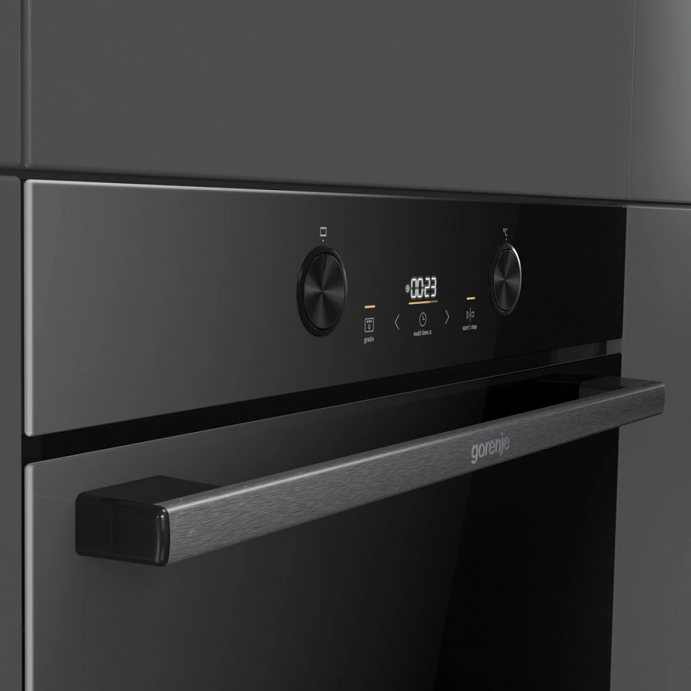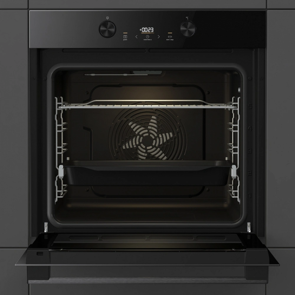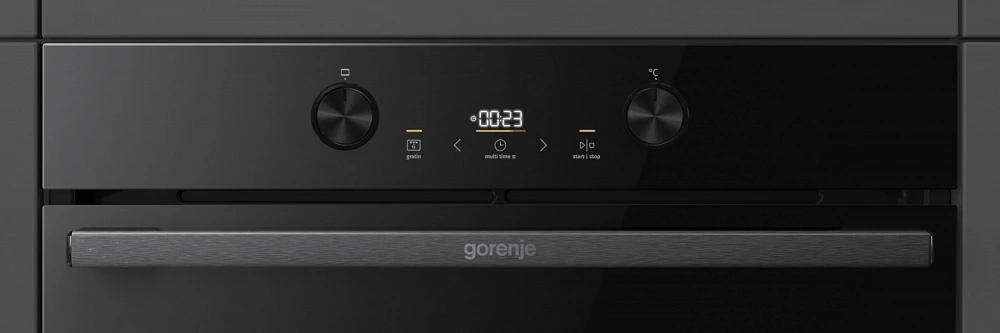 дисплей, полностью стеклянная внутренняя поверхность дверцы духовки, телескопические направляющие, утапливаемые переключатели