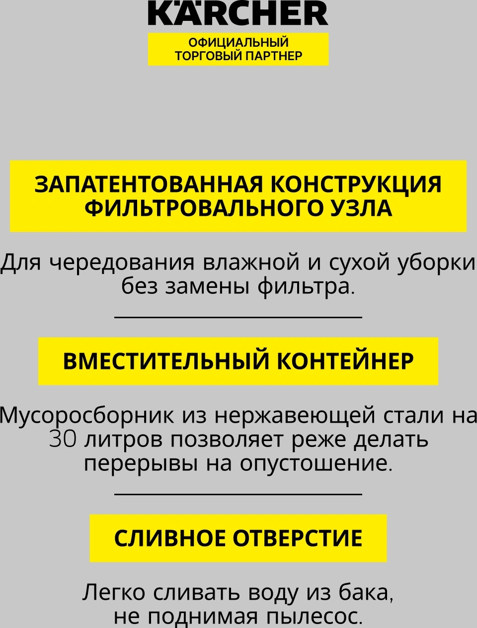 Переключаемая насадка для мокрого и сухого пола; Щелевая насадка; Насадка-пылеуловитель; Гибкий всасывающий шланг: 1 м, 35 мм