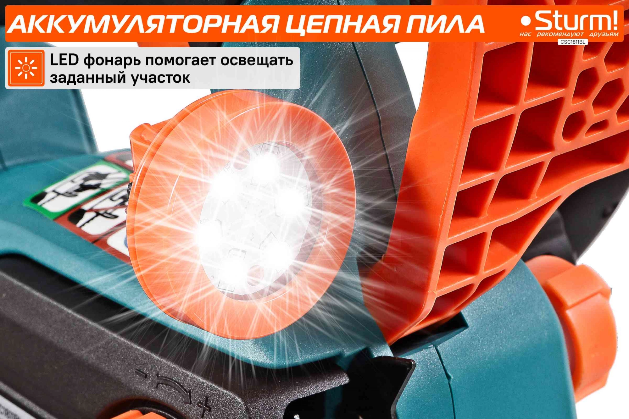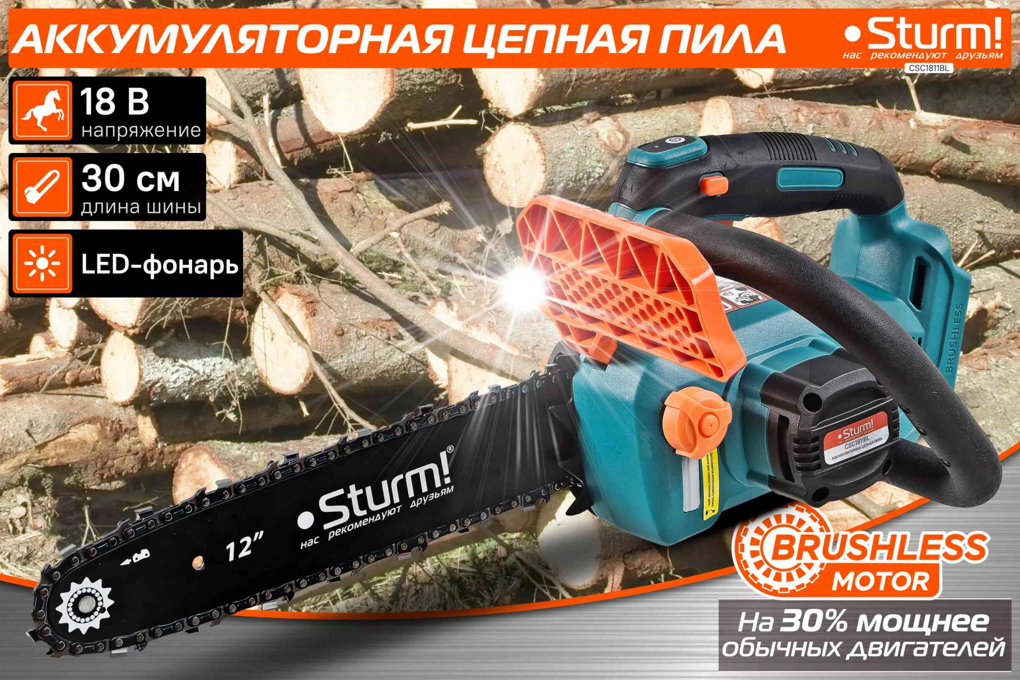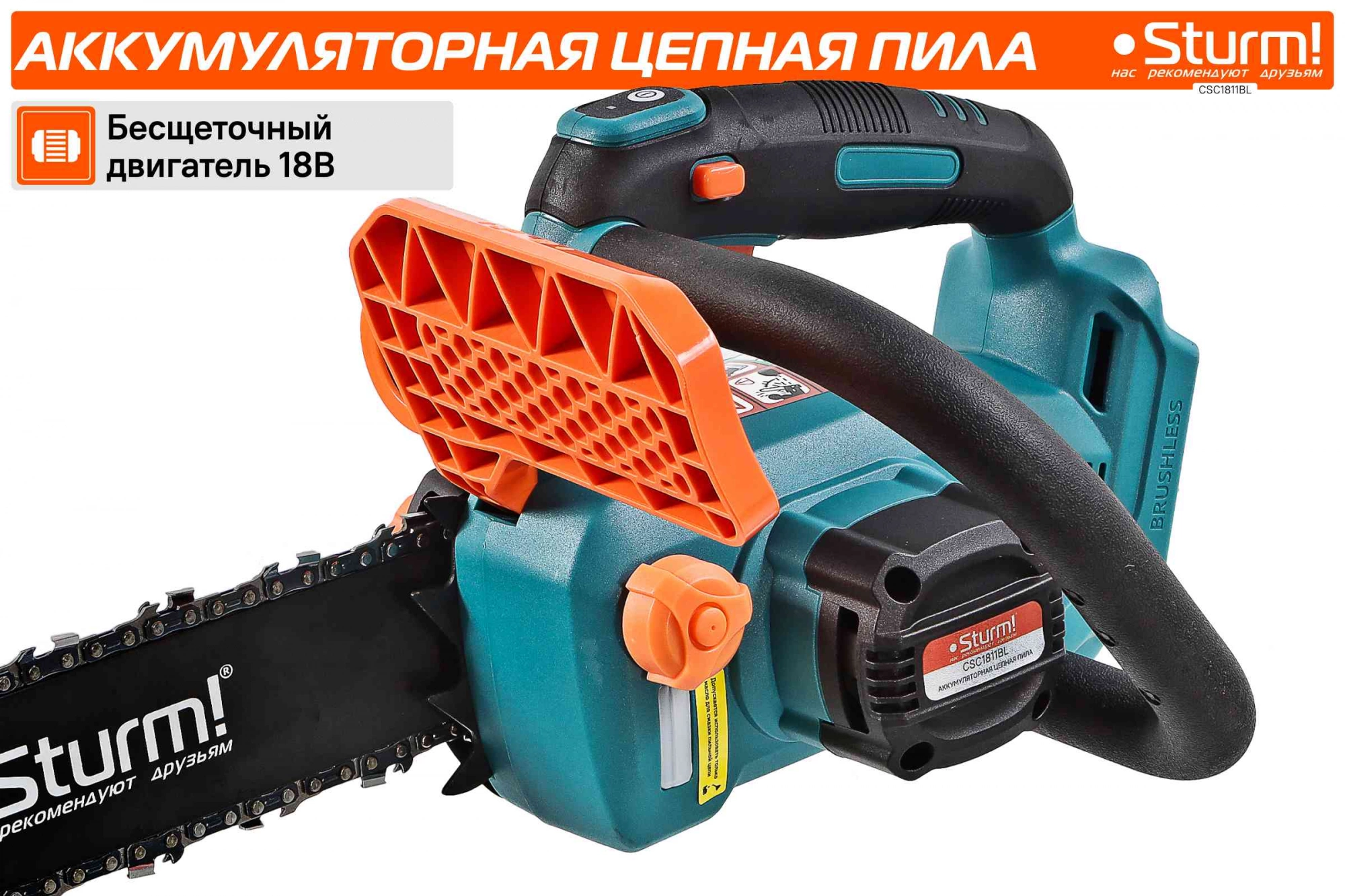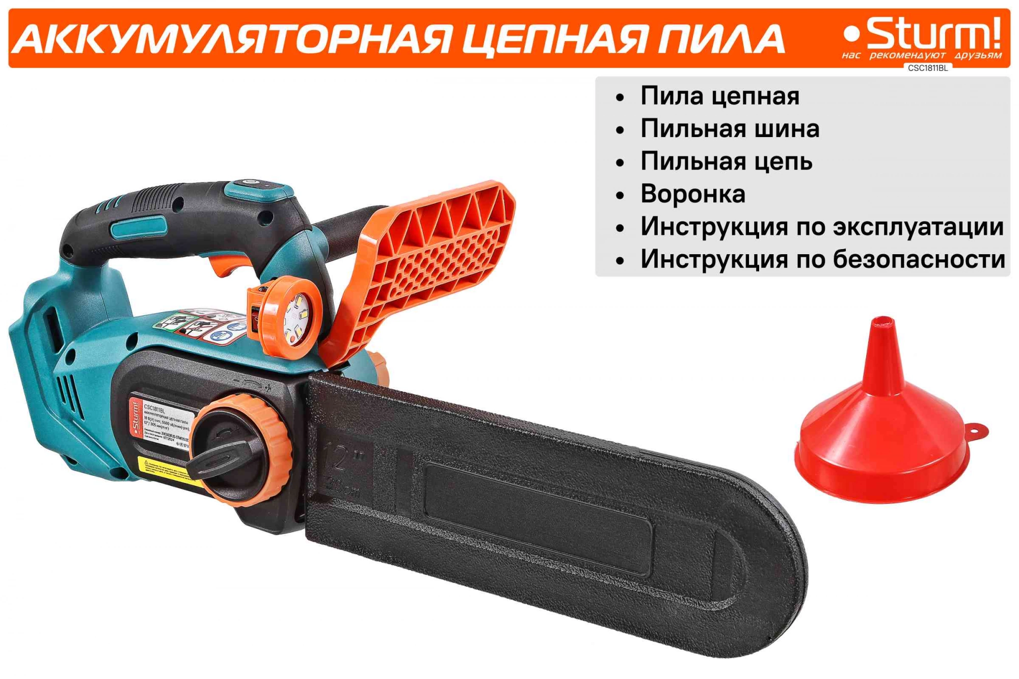 автоматическая смазка цепи, натяжение и замена цепи без использования инструментов, плавный пуск, тормоз цепи