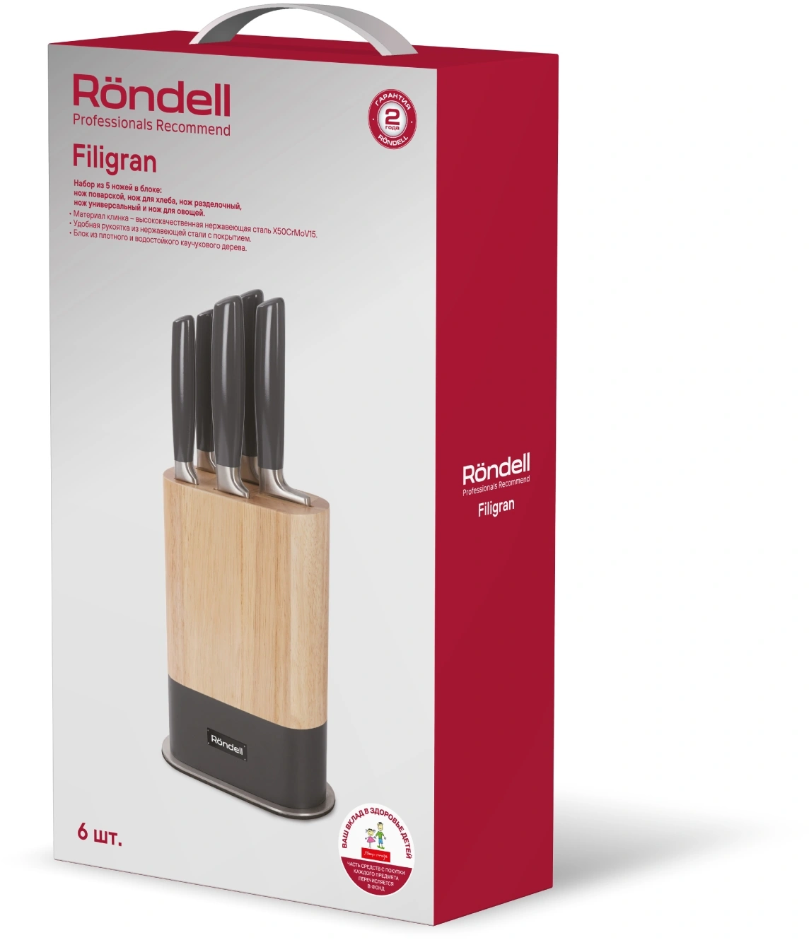 Материал клинка: высококачественная немецкая нержавеющая сталь X50CrMoV15. Материал рукоятки: удобная рукоятка из нержавеющей стали с покрытием. Блок для ножей из плотного и водостойкого каучукового дерева Особенности клинка: двусторонняя заточка лезвий.
