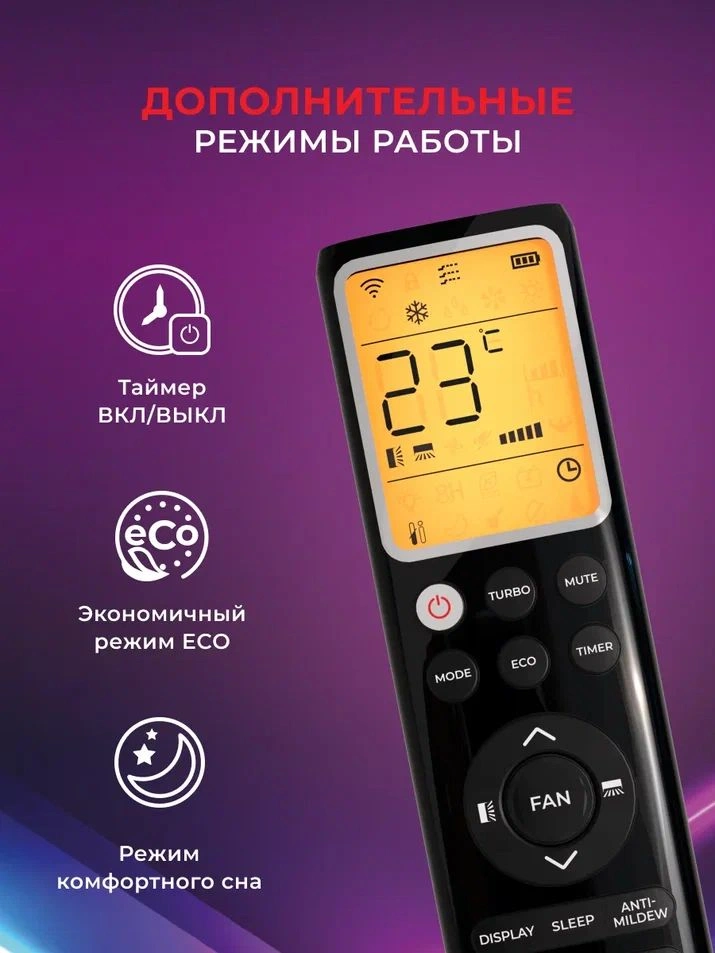 дисплей, память настроек, память положения жалюзи, регулировка силы воздушного потока, таймер, управление с мобильного телефона