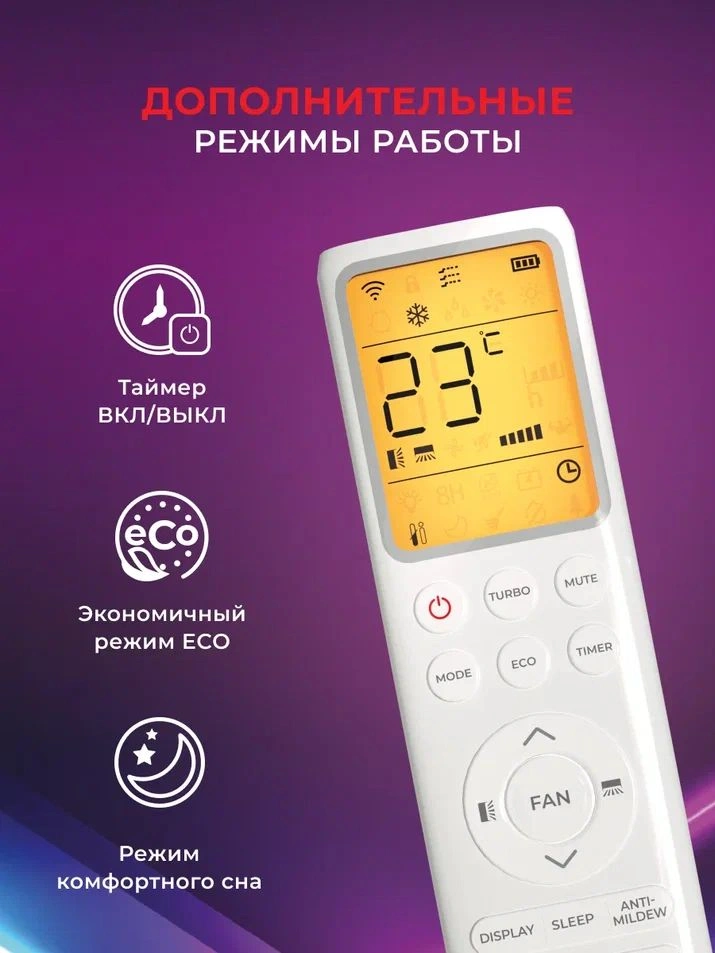 дисплей, память настроек, память положения жалюзи, регулировка положения жалюзи с пульта, регулировка силы воздушного потока, таймер, управление с мобильного телефона