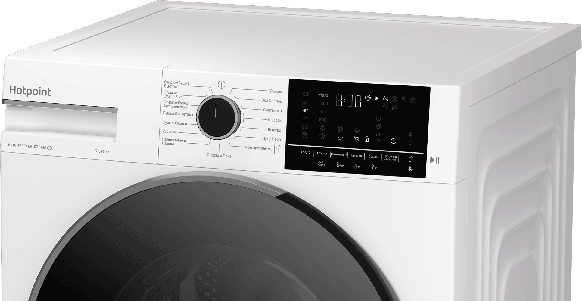 Полоскание+ Отжим, Отжим+слив, Сушка хлопок, Сушка синтетика, Стирка+сушка, Стирка+сушка, Быстро, Стирка+Сушка 5 кг, Быстро 14’, Функция Антисминание