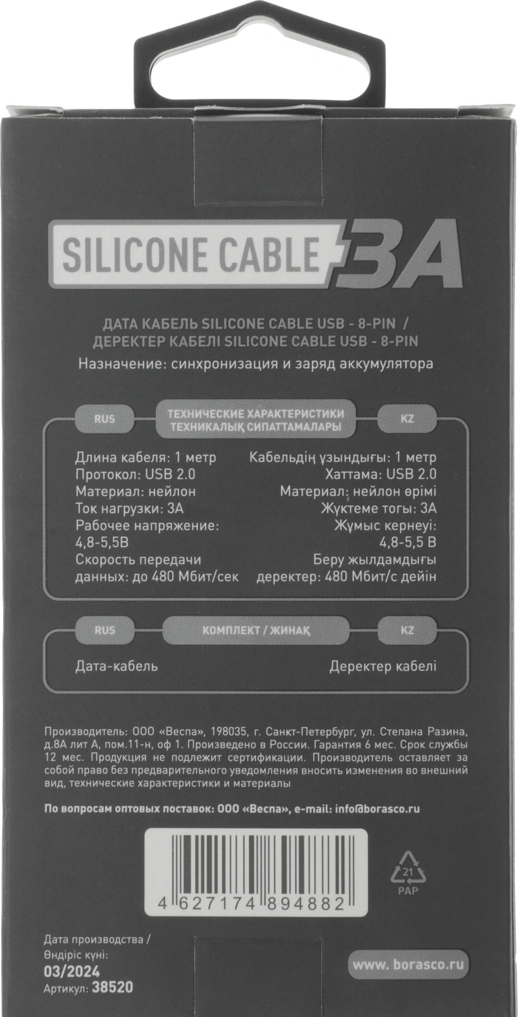 Кабель BoraSCO 38520 USB (m)-Lightning (m) 1м красный коробка