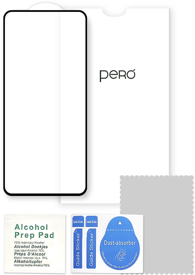 Защитное стекло PERO FULL COVER & FULL GLUE GLASS имеет прокрашенную тонкую рамку по периметру. Комплектация: защитное стекло, влажная и сухая салфетка, стикеры для удаления пыли.