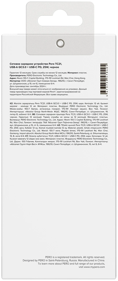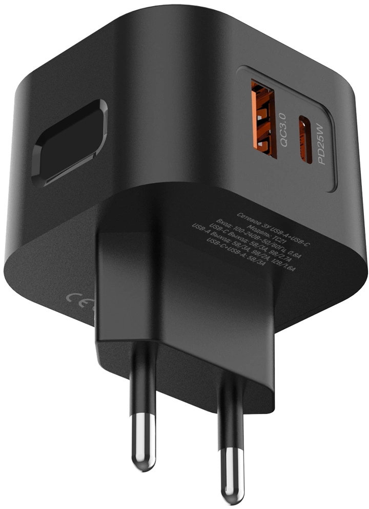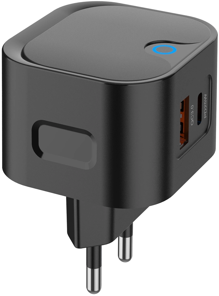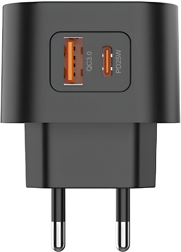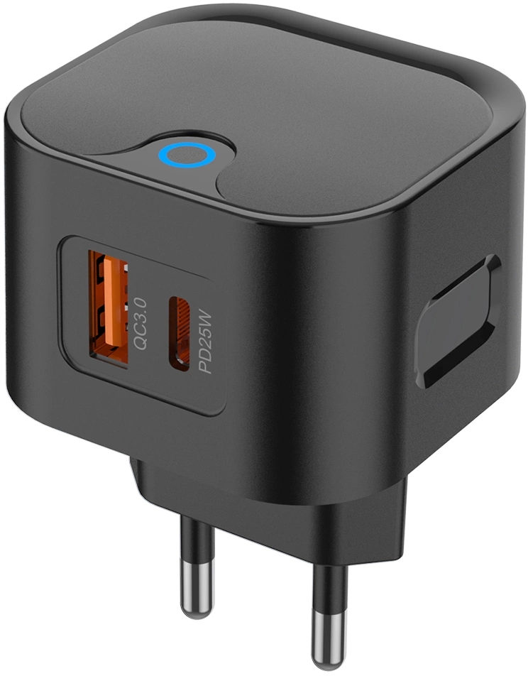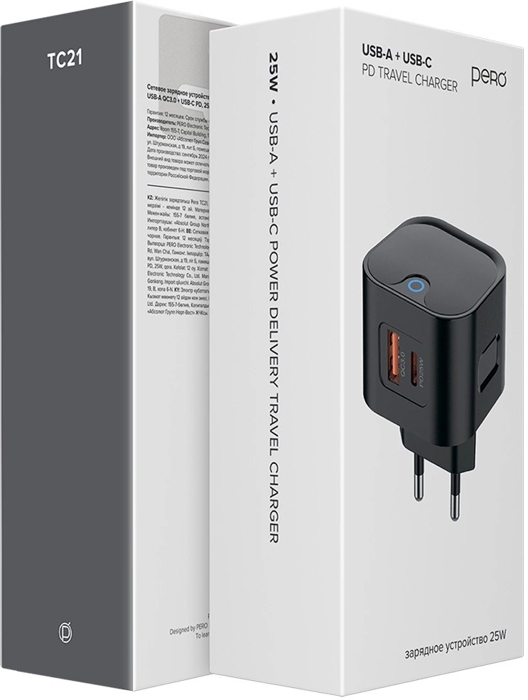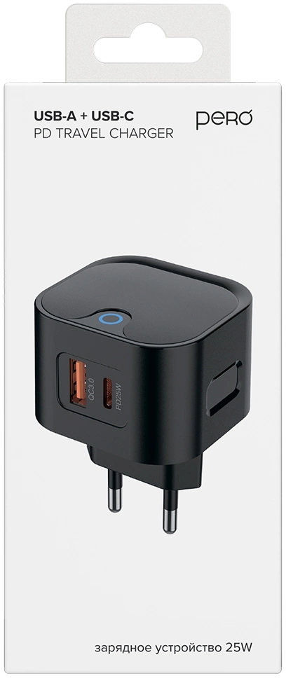 Сетевое зарядное устройство PERO TC21 оснащено 2-мя USB-портами — USB-А с выходным током до 3А и USB-C с функцией быстрой зарядки Power Delivery, мощностью 25W. СЗУ имеет функцию fast charge и защиту от перегрузок и перегрева. Входное напряжение: 110-240В, 50-60Гц. Цвет: черный.