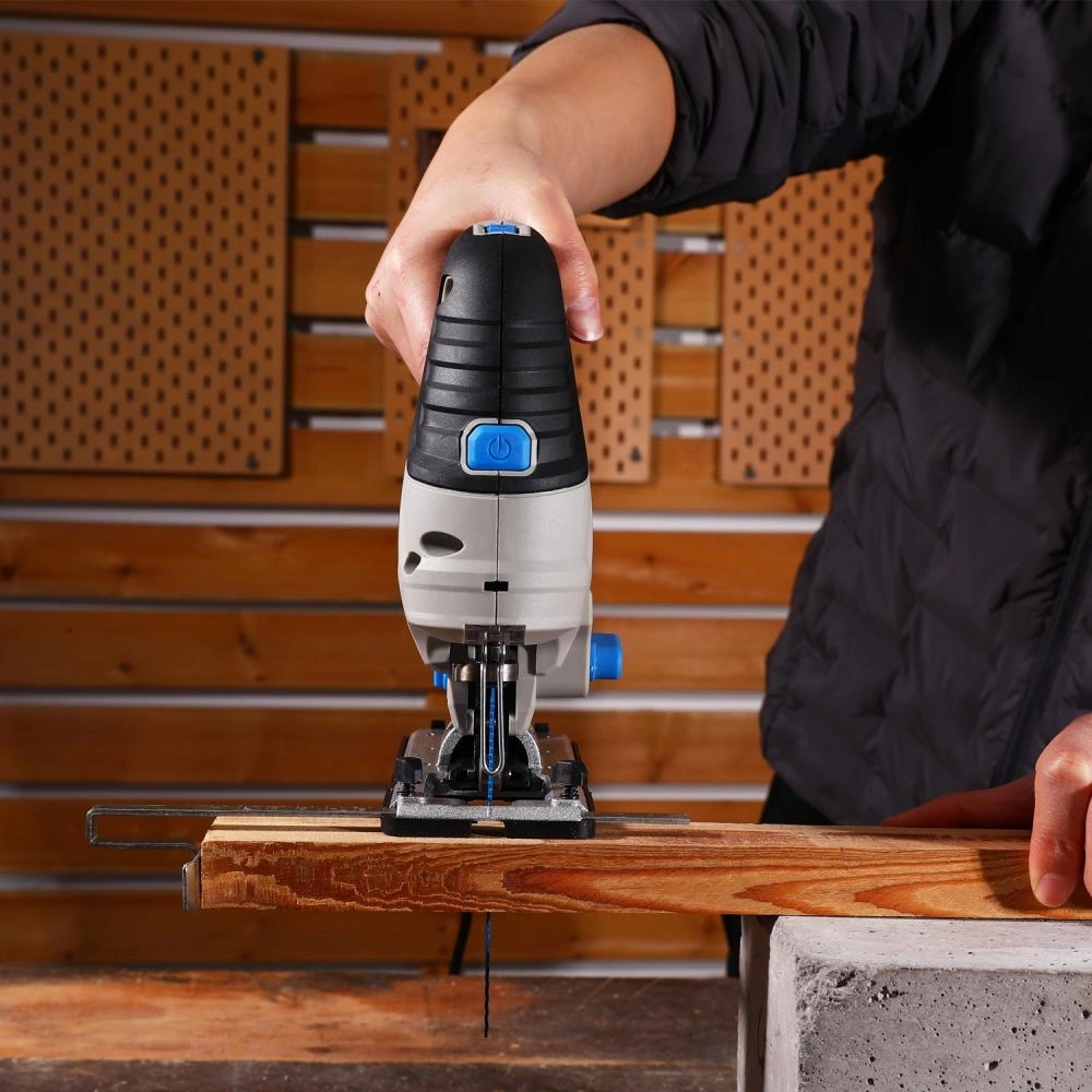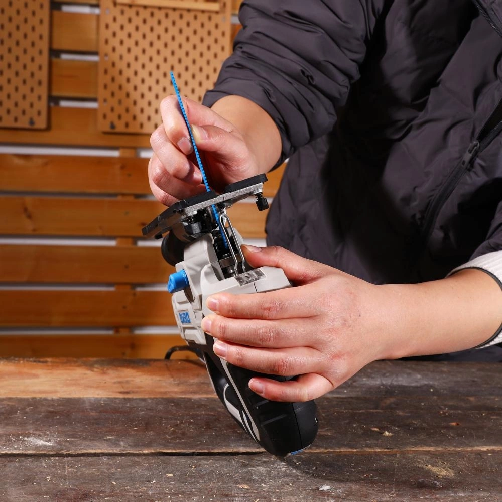 Электролобзик, пильное лезвие, шестигранный ключ, параллельный упор, пылеотводящий патрубок, угольные щетки - 2 шт., руководство по эксплуатации.
