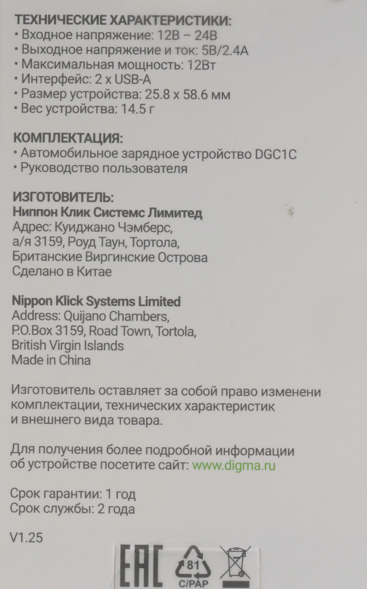 12W 2.4A 2xUSB белый (DGC1C2LX22WH)