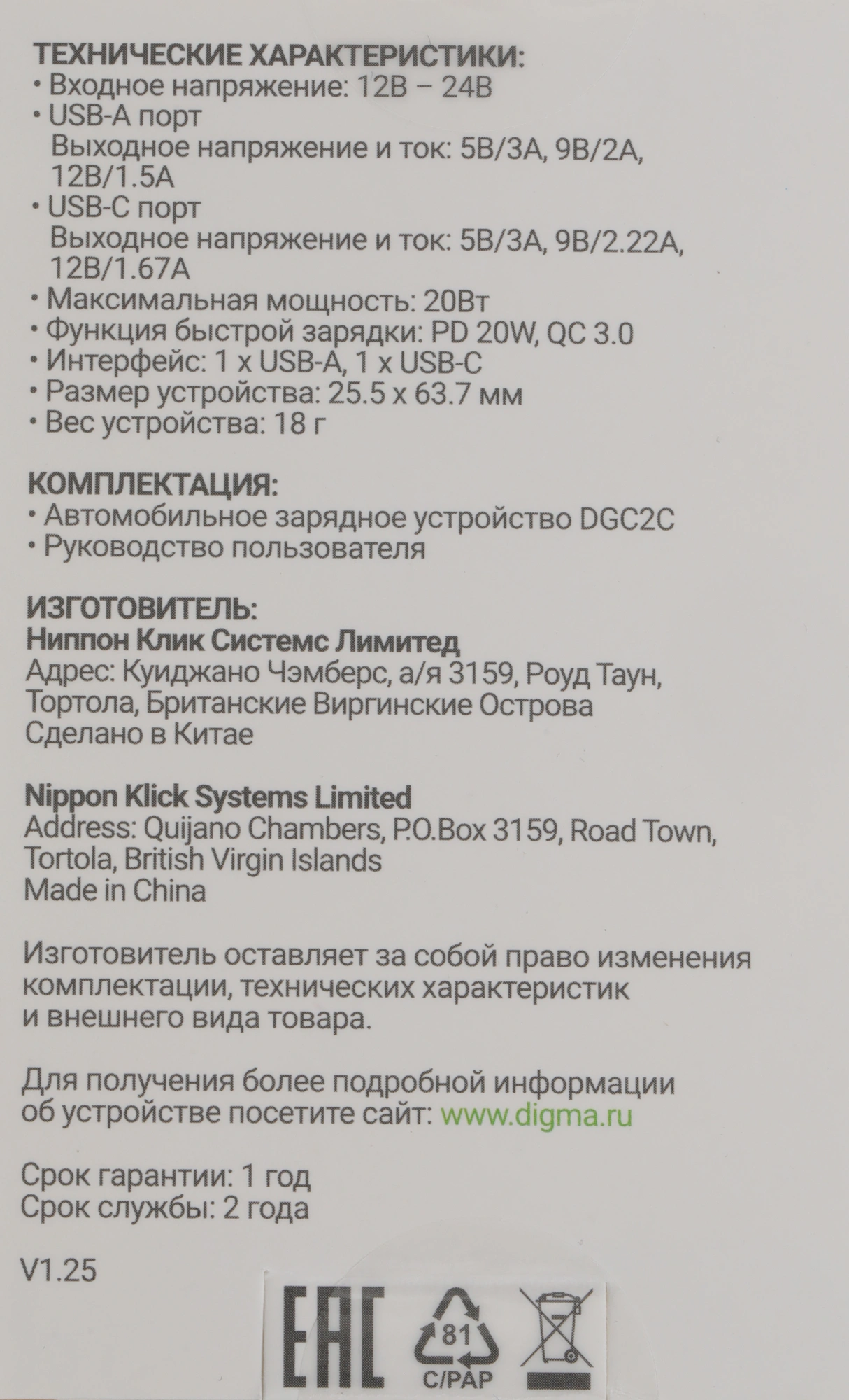 20W 3A (PD+QC) USB-C/USB-A белый (DGC2C0HX12WH)