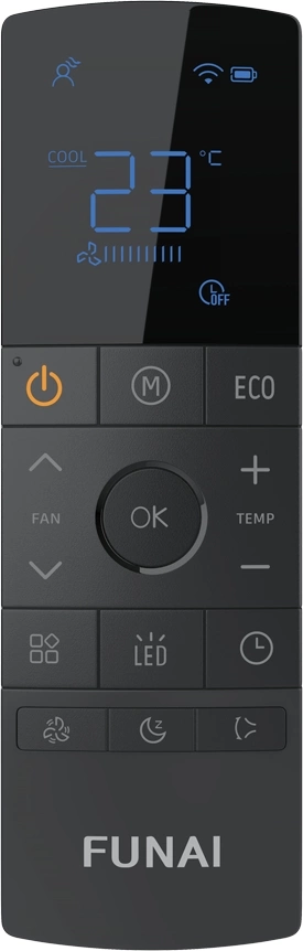 дисплей, регулировка положения жалюзи с пульта, регулировка силы воздушного потока, таймер, управление с мобильного телефона