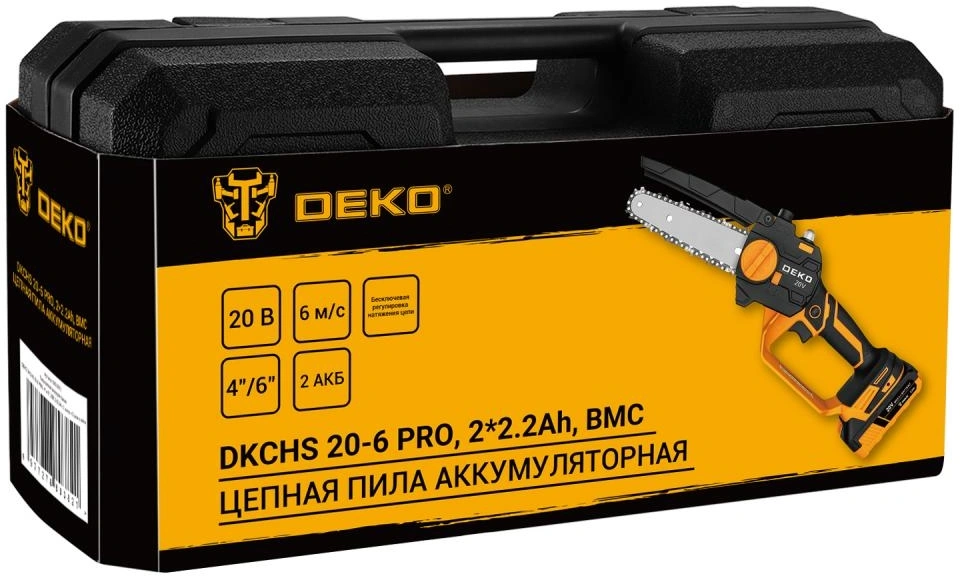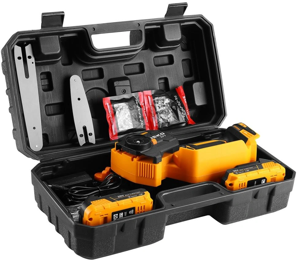 Пила, Защитный кожух, Шина - 2 шт (4" (100 мм)/6"(150 мм)), Цепь - 2 шт (28/36 шт), АКБ - 2 шт, Барашек регулировки натяжения, Зарядное устройство, Шестигранный ключ, Крепежный комплект (винт, шайба , пружина), Руководство по эксплуатации