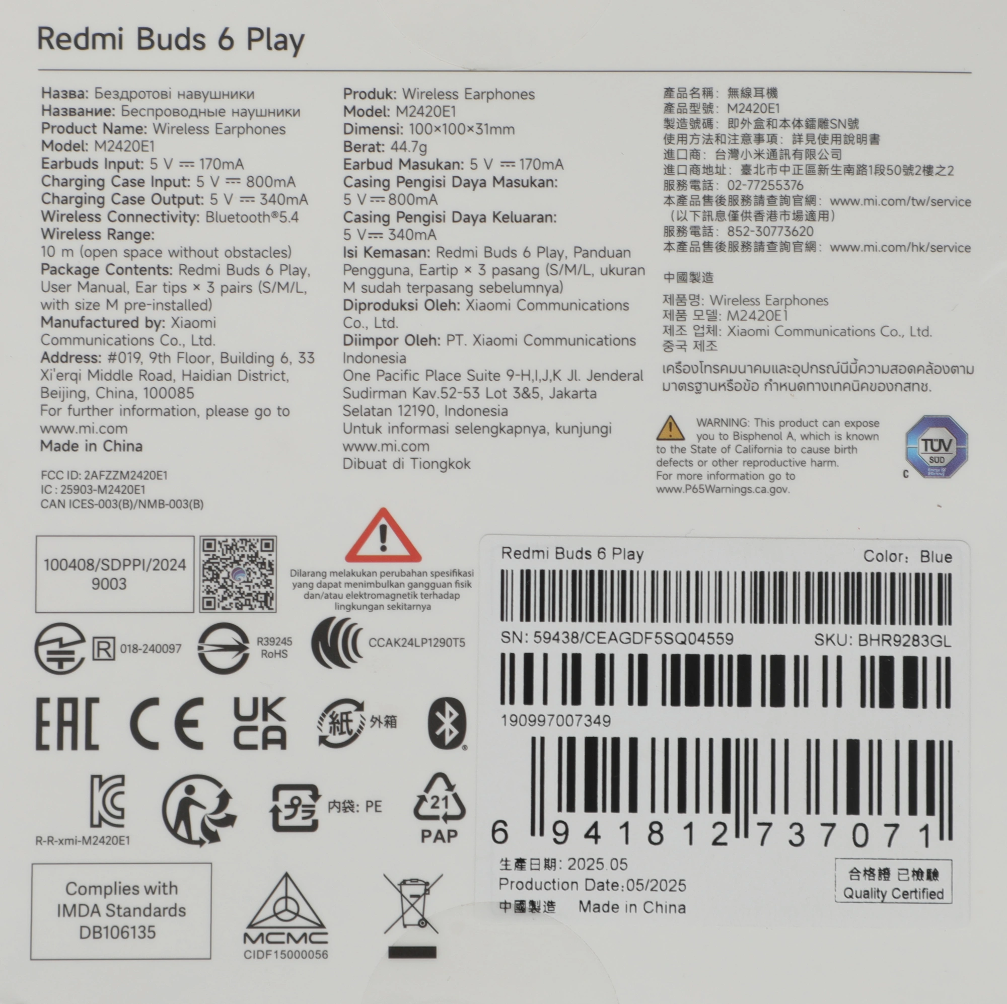 Беспроводные внутриканальные наушники; передача сигнала–Bluetooth 5.4; Степень пылевлагозащиты IP-IPX4; Мин./макс. воспроизводимая частота 20 Гц/20000 Гц; Сопротивление (импеданс)-16 Ом; Мощность-10 мВт; Тип индикатора заряда-LED; номинальный вход/выход кейса- 5В-800мА/5В-340мА