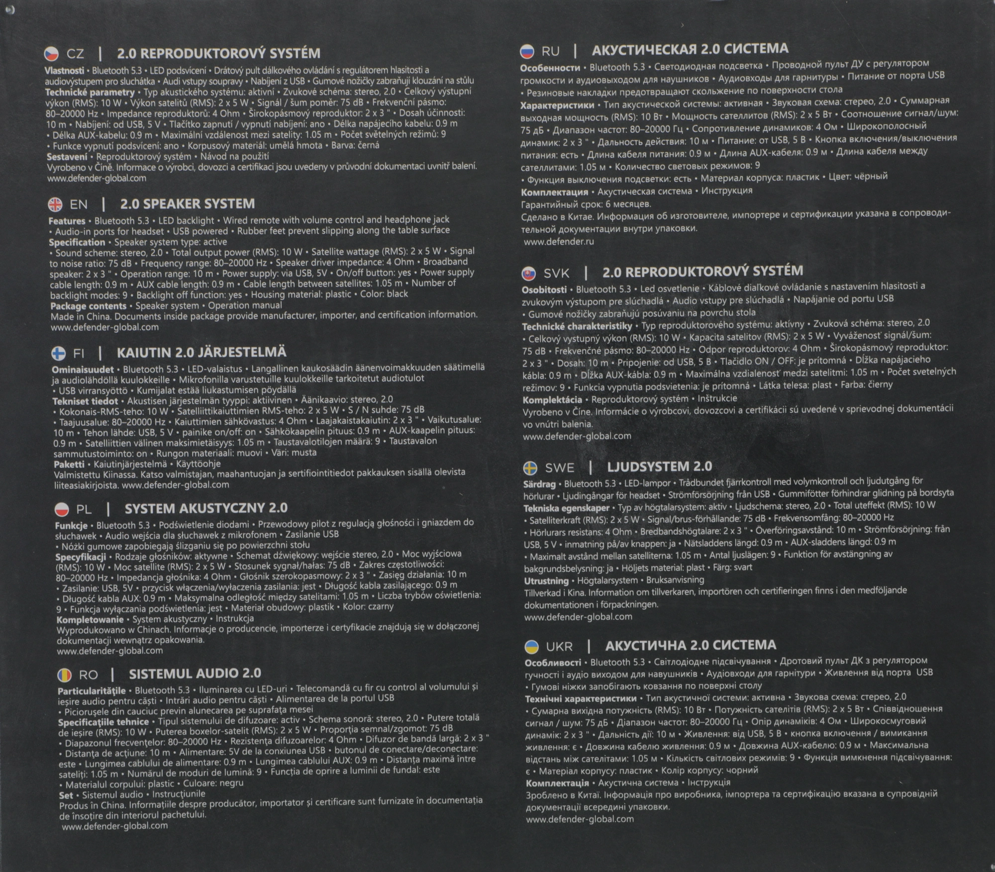 Bluetooth 5.3. Светодиодная подсветка. Проводной пульт ДУ с регулятором громкости и аудиовыходом для наушников. Аудиовходы для гарнитуры. Питание от порта USB. Резиновые накладки предотвращают скольжение по поверхности стола