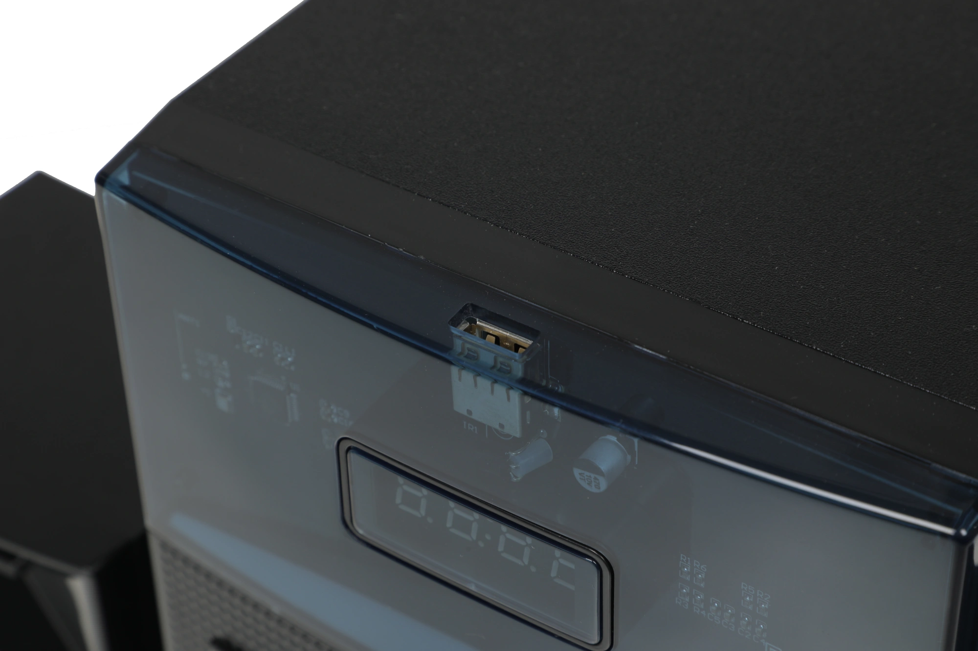Мощная система 2.1 в деревянном корпусе. Bluetooth 5.3. Информационный дисплей на сабвуфере. Беспроводной пульт ДУ. Встроенный FM-приемник. Поддерживает USB накопители. Встроенный MP3-плеер. AUX-аудиовход. Подсветка сабвуфера. Эквалайзер