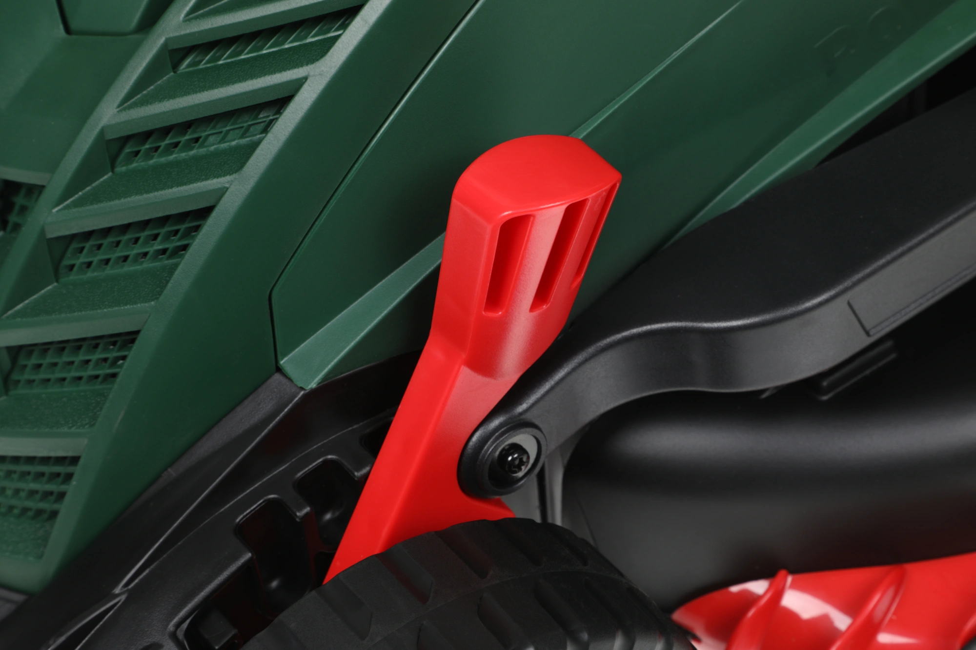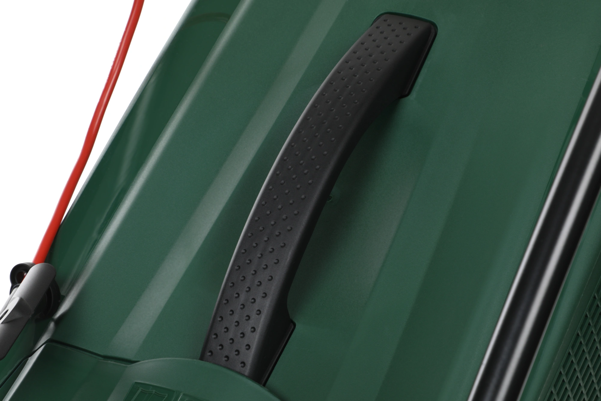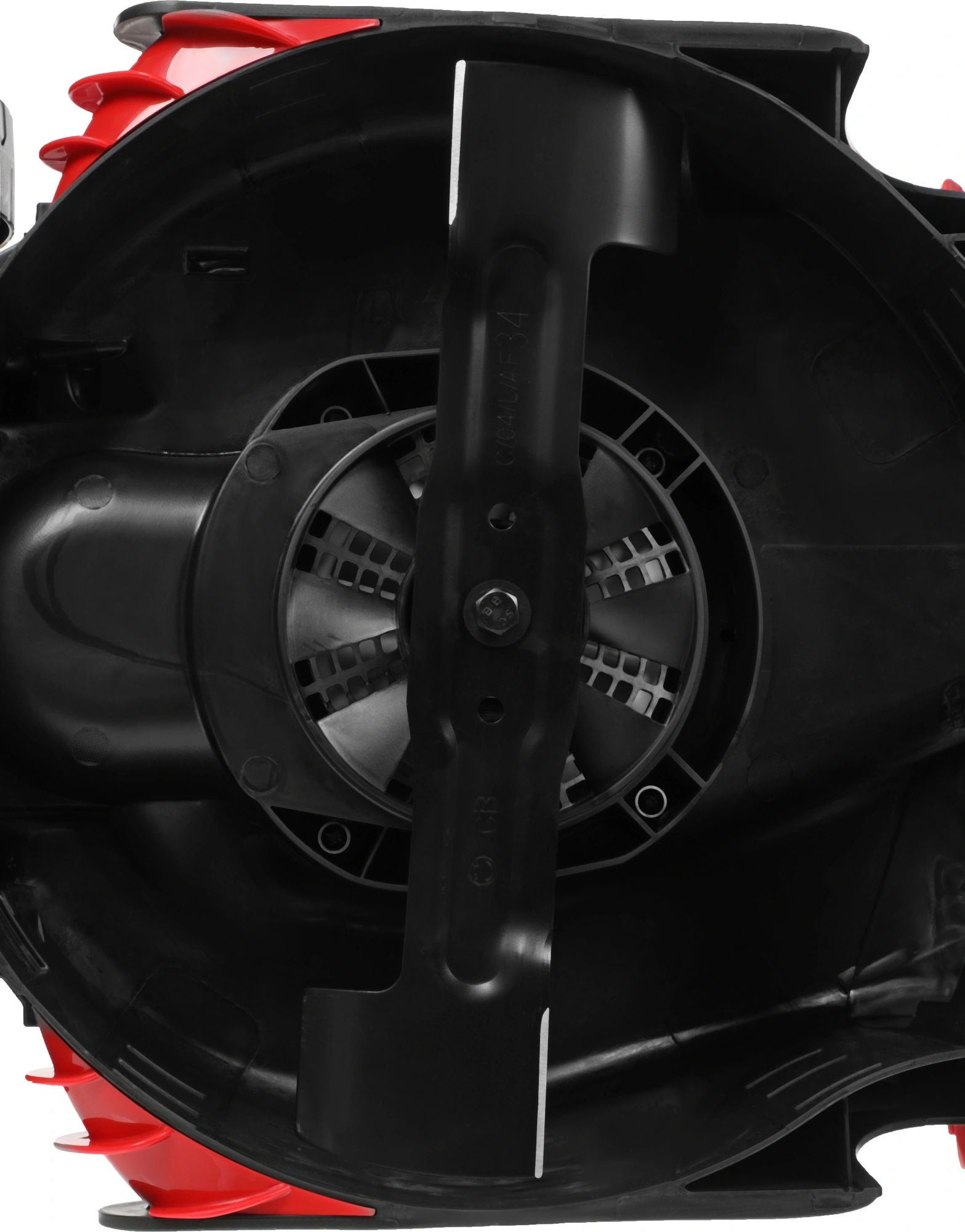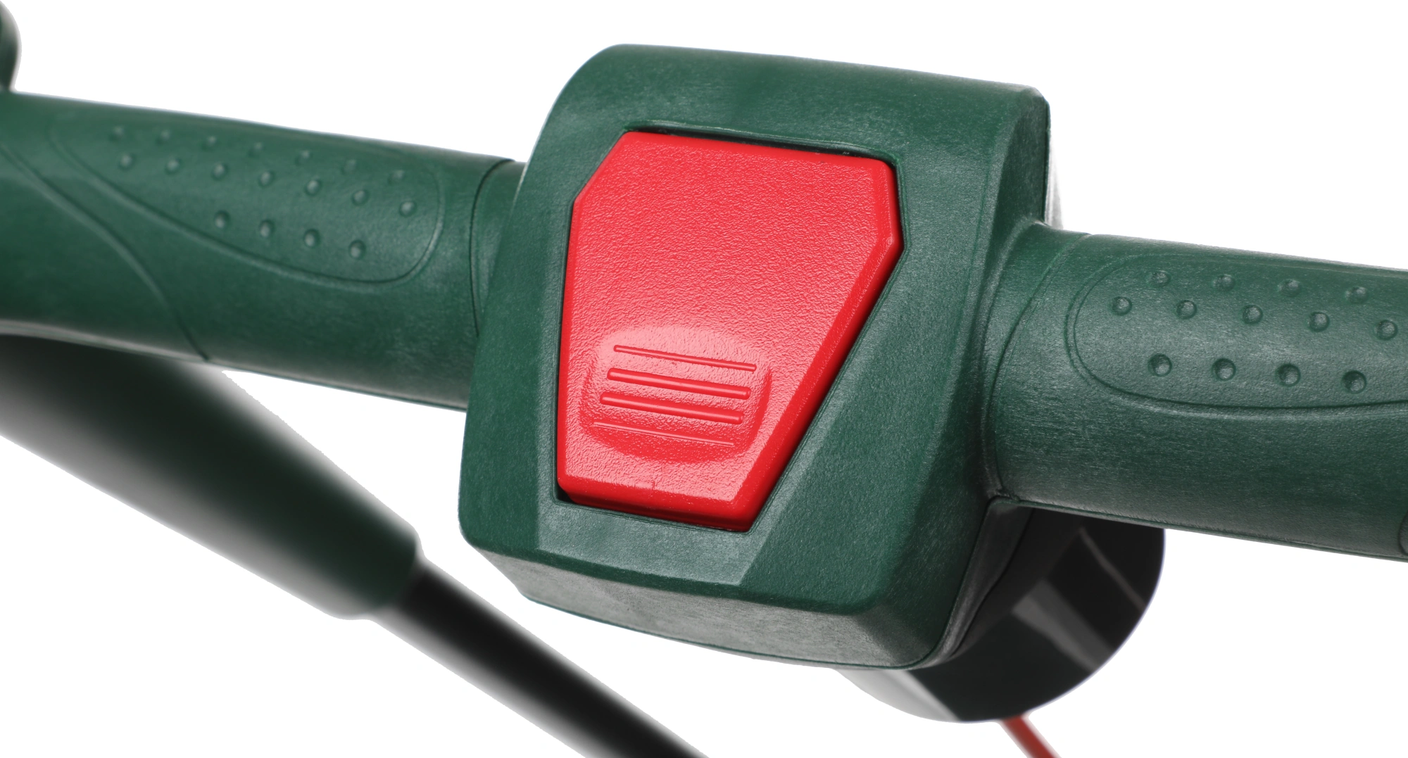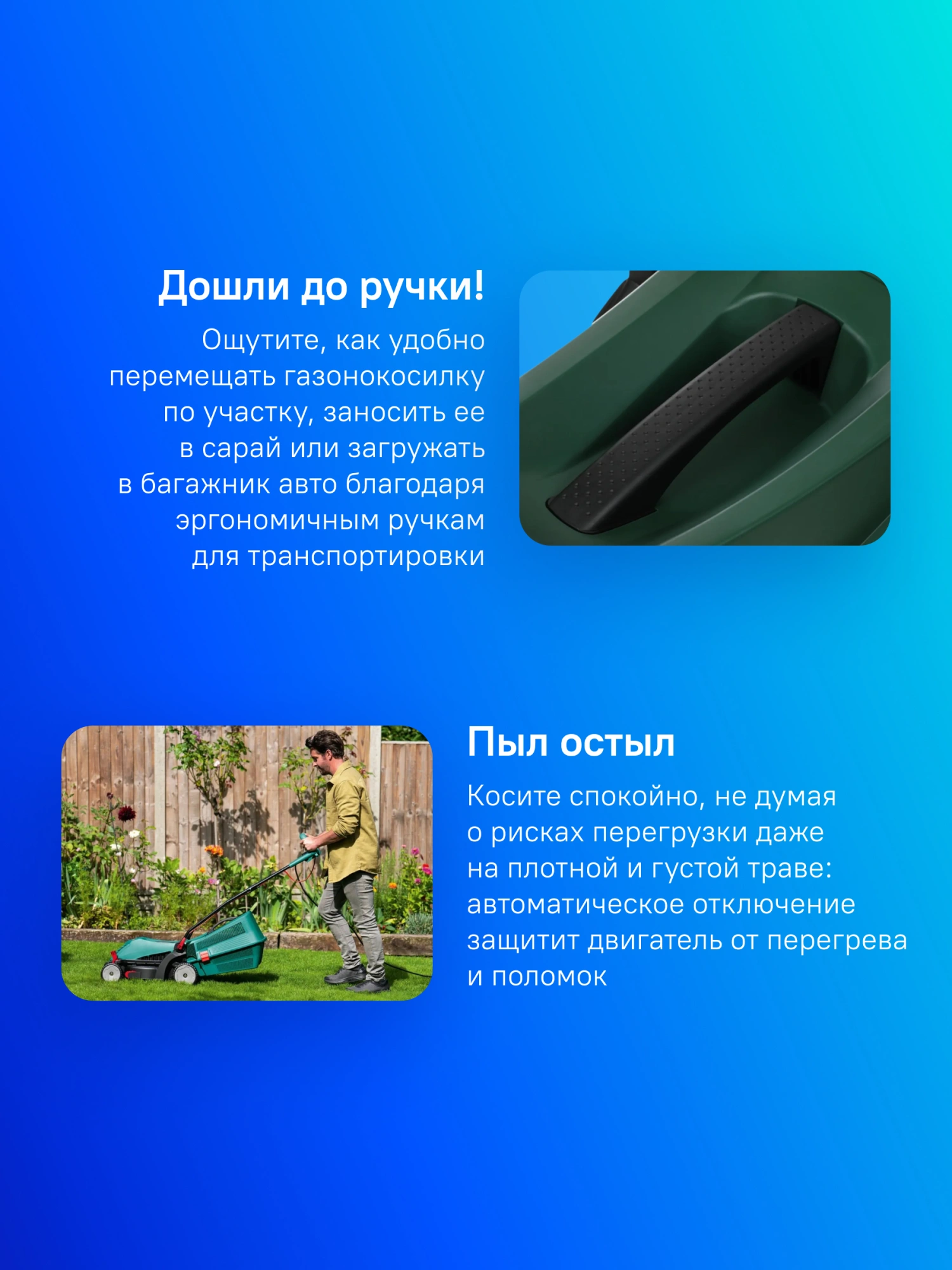 защита от перегрузок, регулировка высоты скашивания, ручки для транспортировки, складная ручка