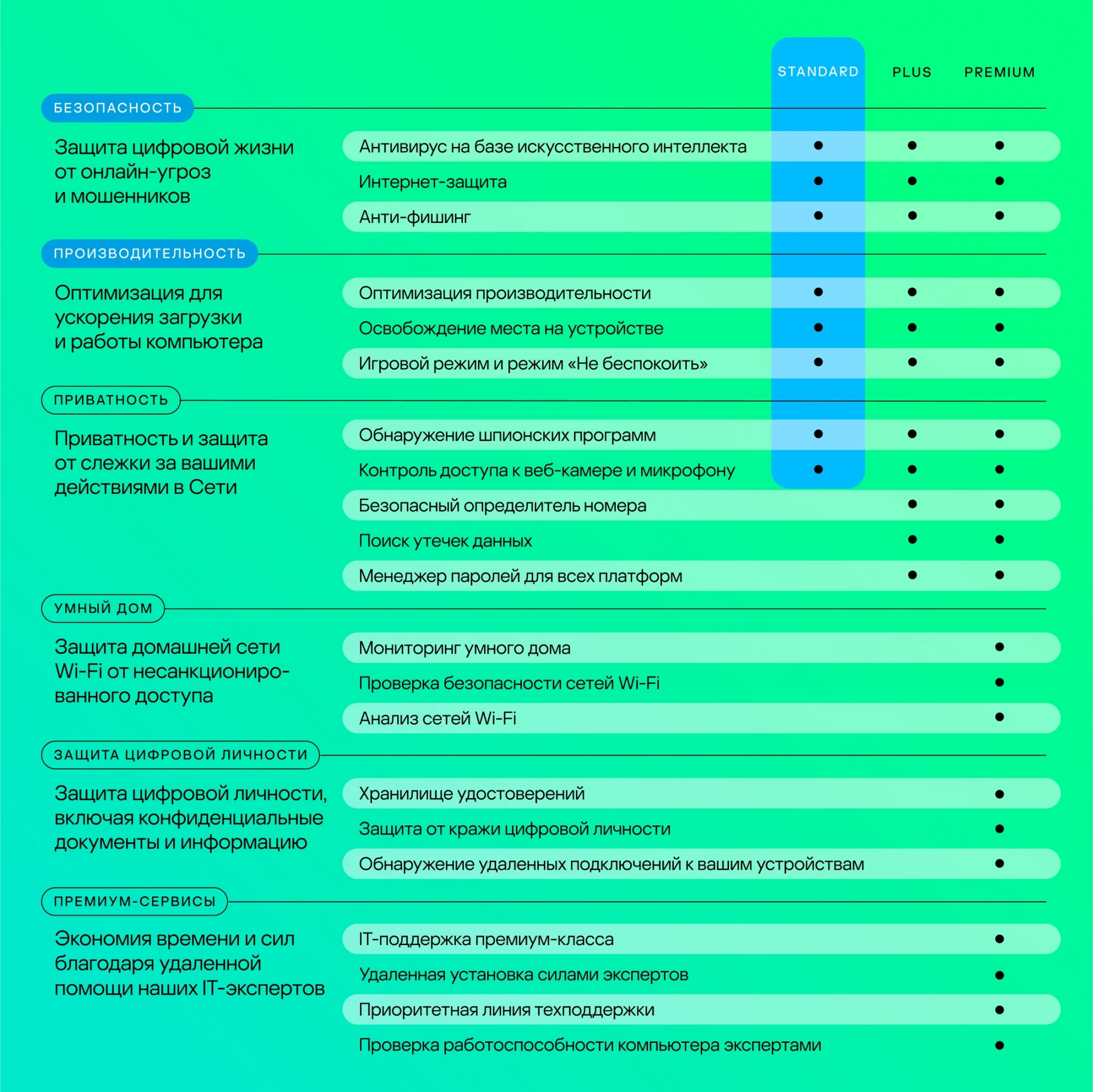 Решение предоставляет полный набор функций для защиты конфиденциальности: безопасность данных и онлайн-платежей, надежное управление паролями, обнаружение несанкционированного подключения к сети Wi-Fi, а также защиту от звонков спамеров и мошенников.