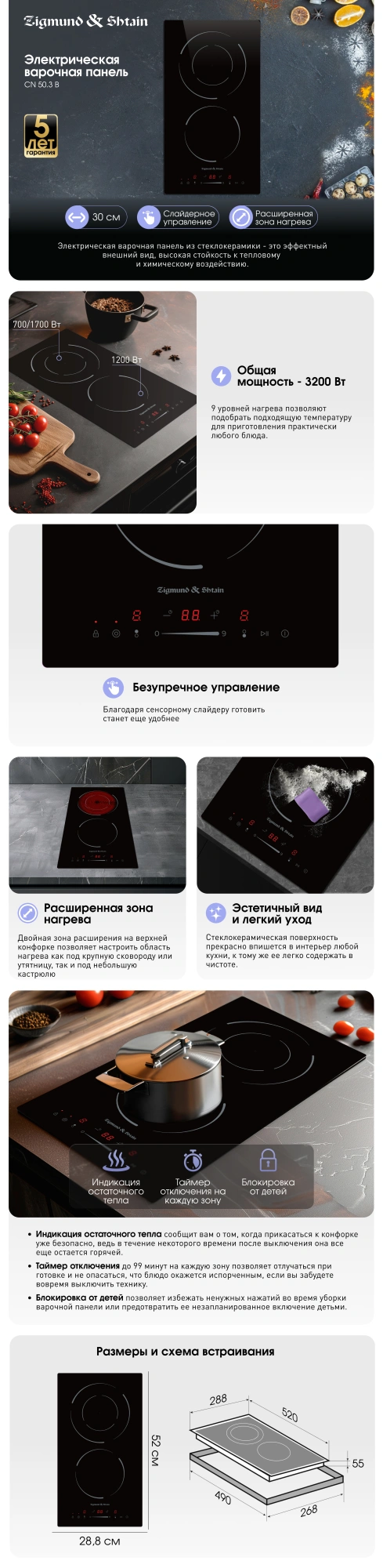 блокировка управления (защита от детей), защитное отключение, отключение при проливе жидкости