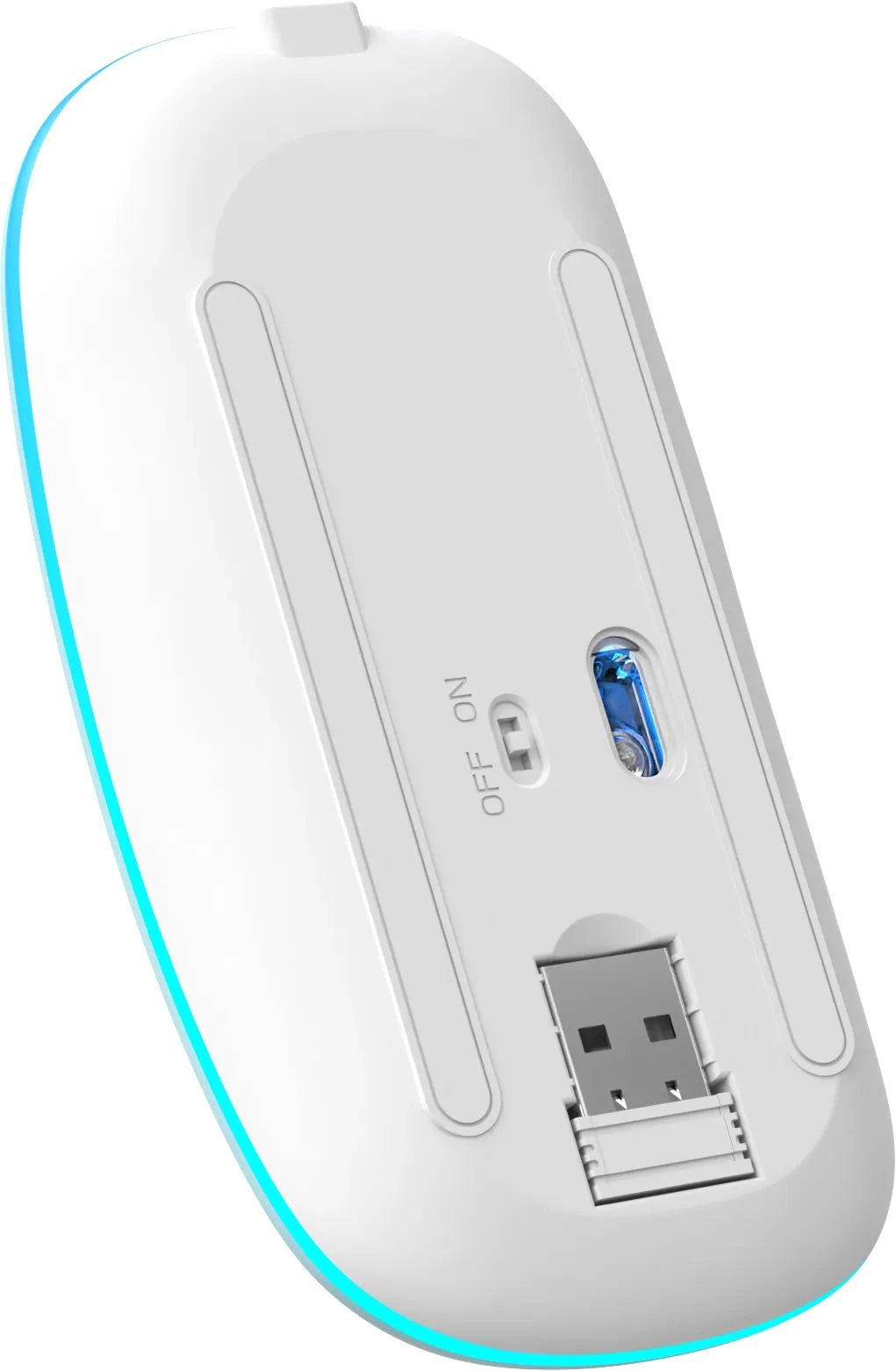 Беспроводная ультратонкая мышка с радужной подсветкой, встроенным аккумулятором и двумя режимами подключения: по радиоканалу 2,4ГГц или по Bluetooth. Модель имеет симметричную форму удобную для работы любой рукой.