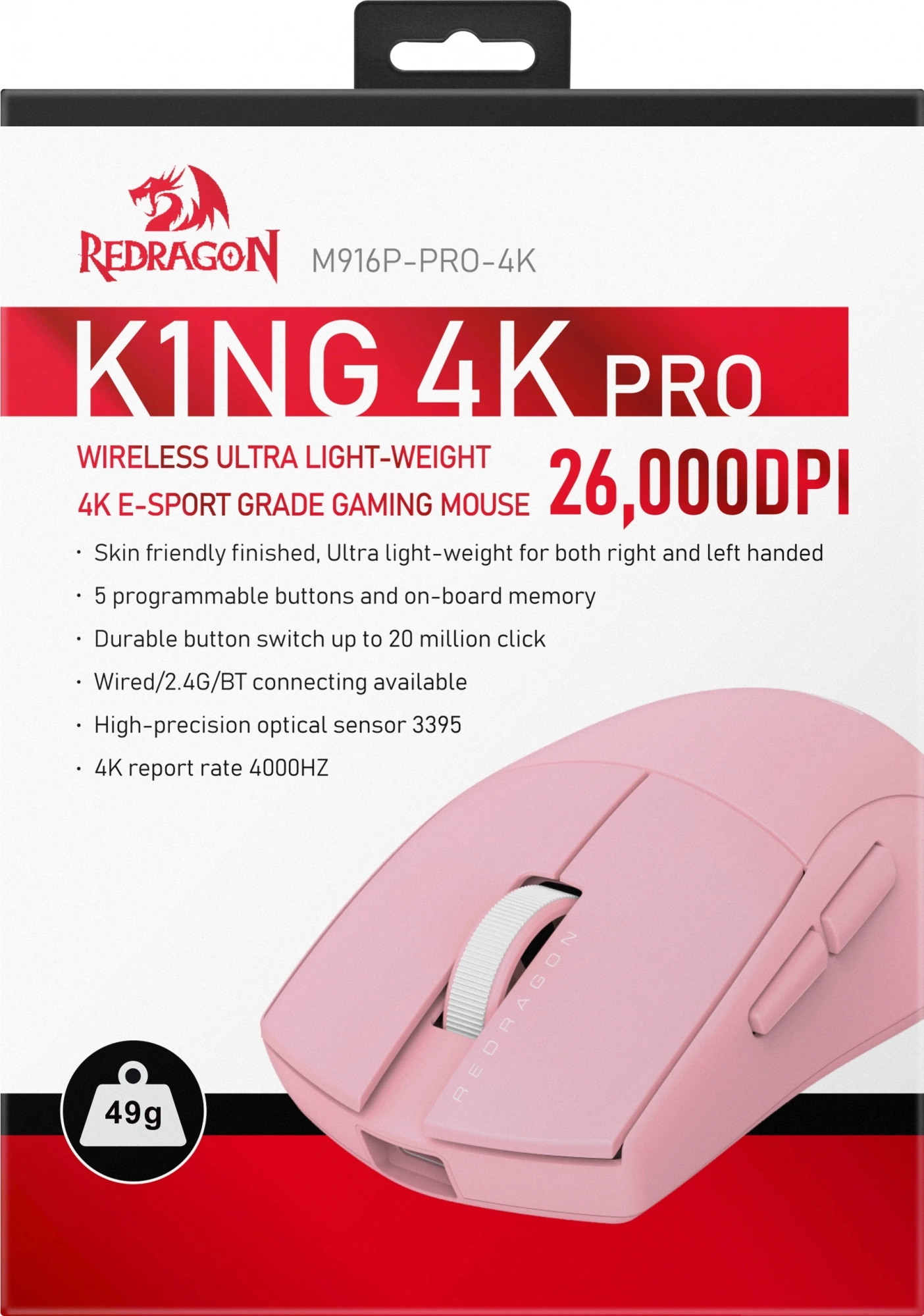 K1NG PRO - мышь весом всего 49 грамм обеспечивает невероятную свободу движения. С высокой частотой опроса 4К она гарантирует мгновенную реакцию на каждое ваше движение, а возможность подключения по 2.4G/BT или проводу значительно упростит работу.