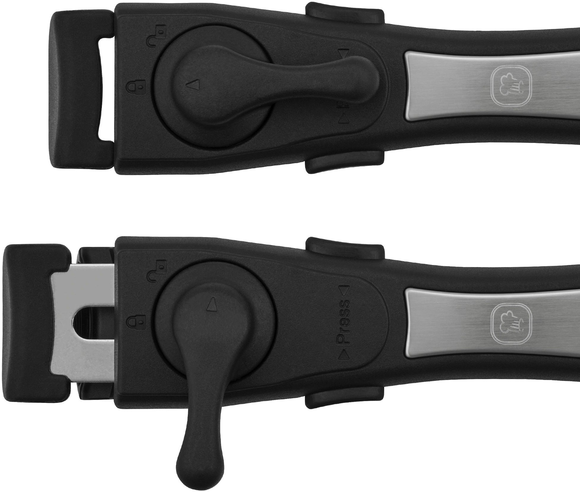 Коллекция Stark, в состав которой входят два великолепных набора. Кастрюлю и сотейник можно использовать как на плите, так и в духовке, отсоединив ручку легким нажатием специальной кнопки (случайности исключены: двойной замок обеспечивает надежность фиксации).