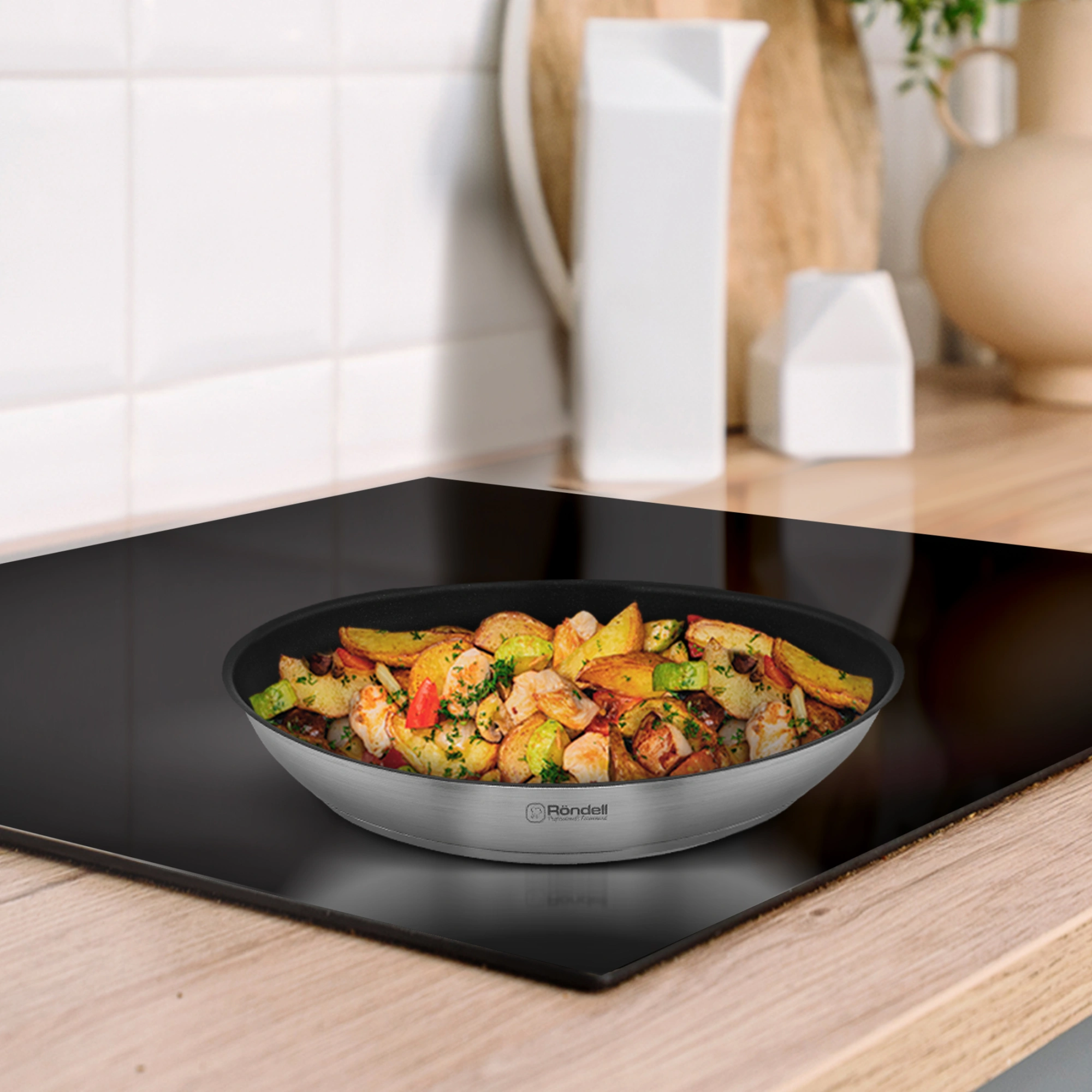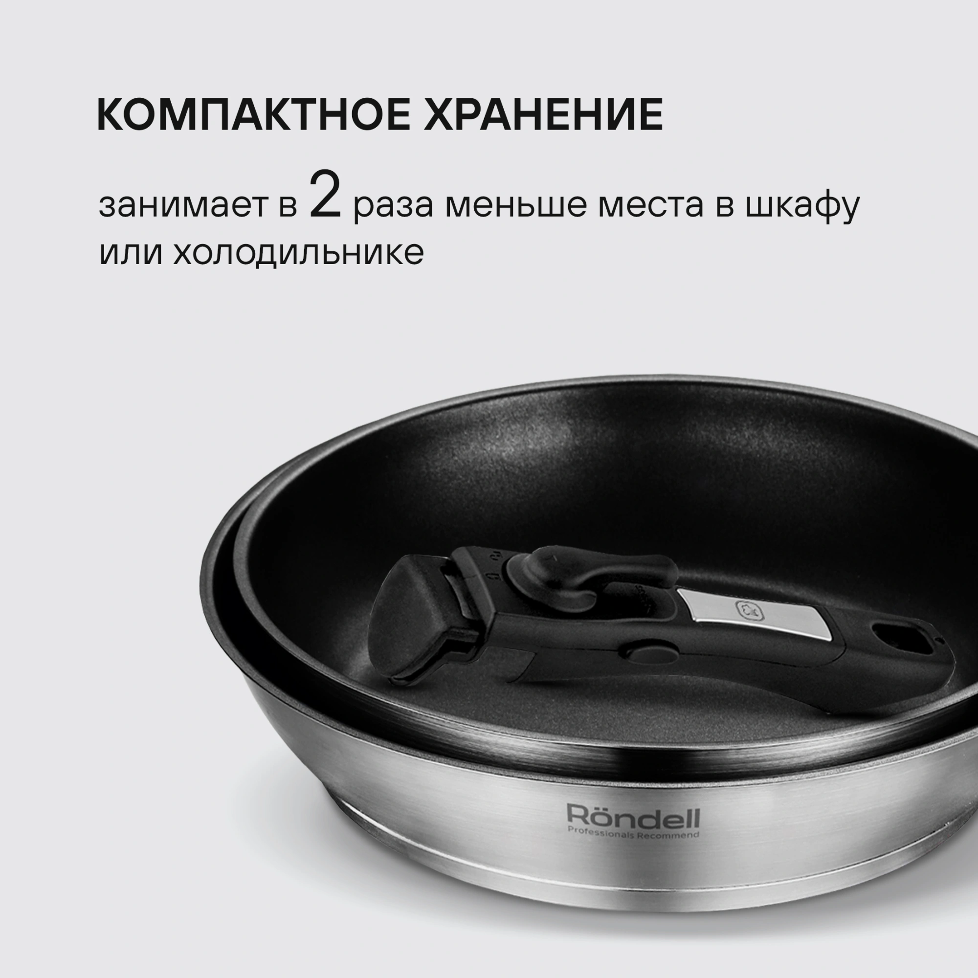 Материал: нержавеющая сталь 18/10, пластик. Аксессуары: съемная ручка с двойной системой фиксации – защита от случайного нажатия. Преимущества: можно готовить в одной посуде на плите и в духовке (без ручки и крышек), эффективно использовать пространство при хранении посуды и экномить место в пмм.
