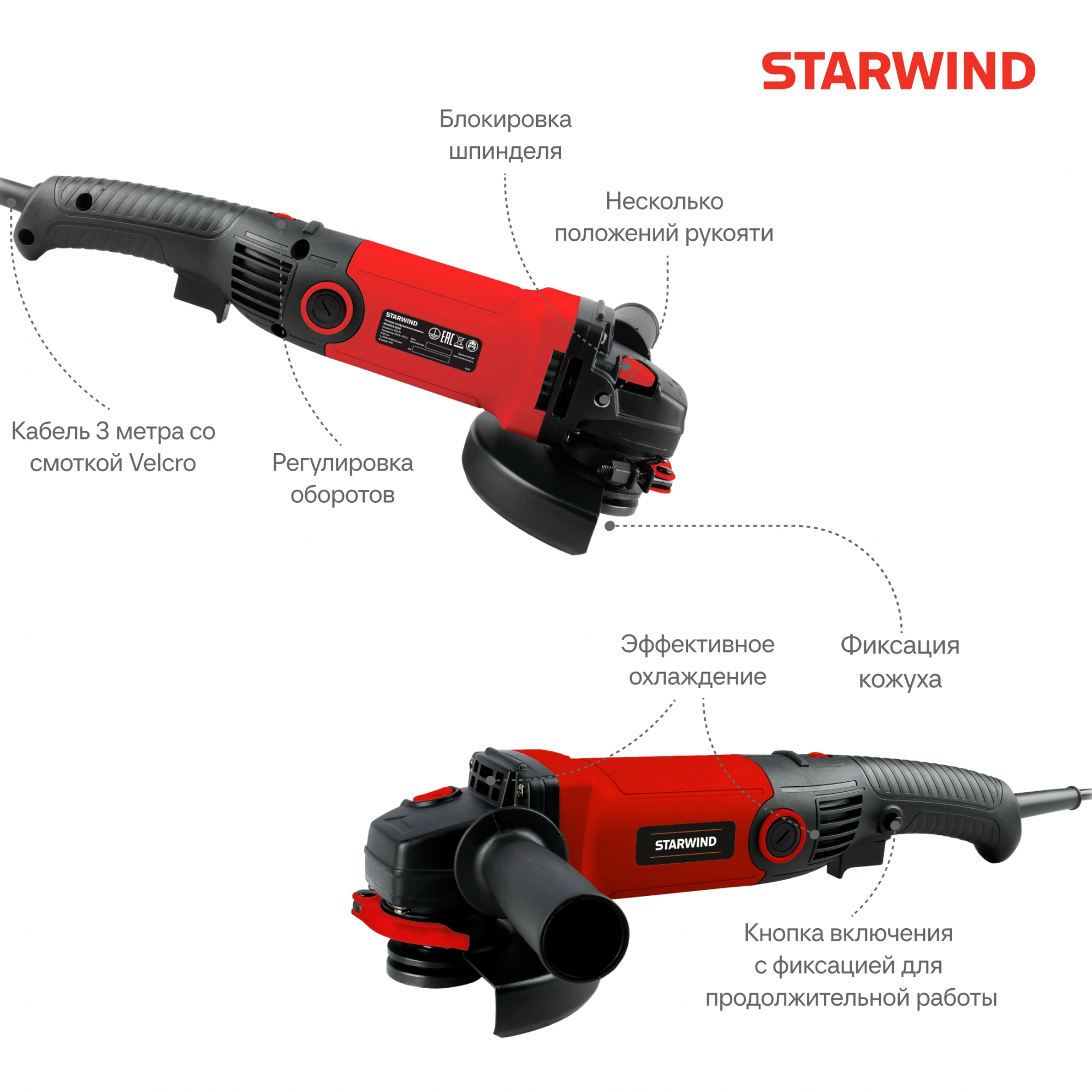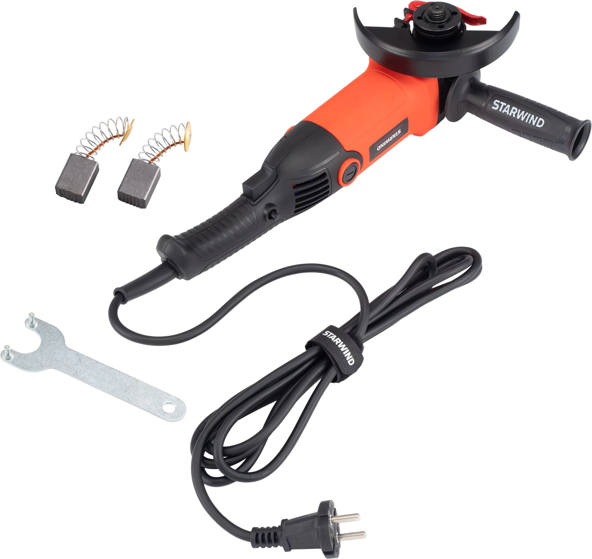 Угловая шлифмашина, дополнительная рукоятка, ключ специальный, угольные щетки - 1 комп, руководство по эксплуатации, защитный кожух, гарантийный талон.