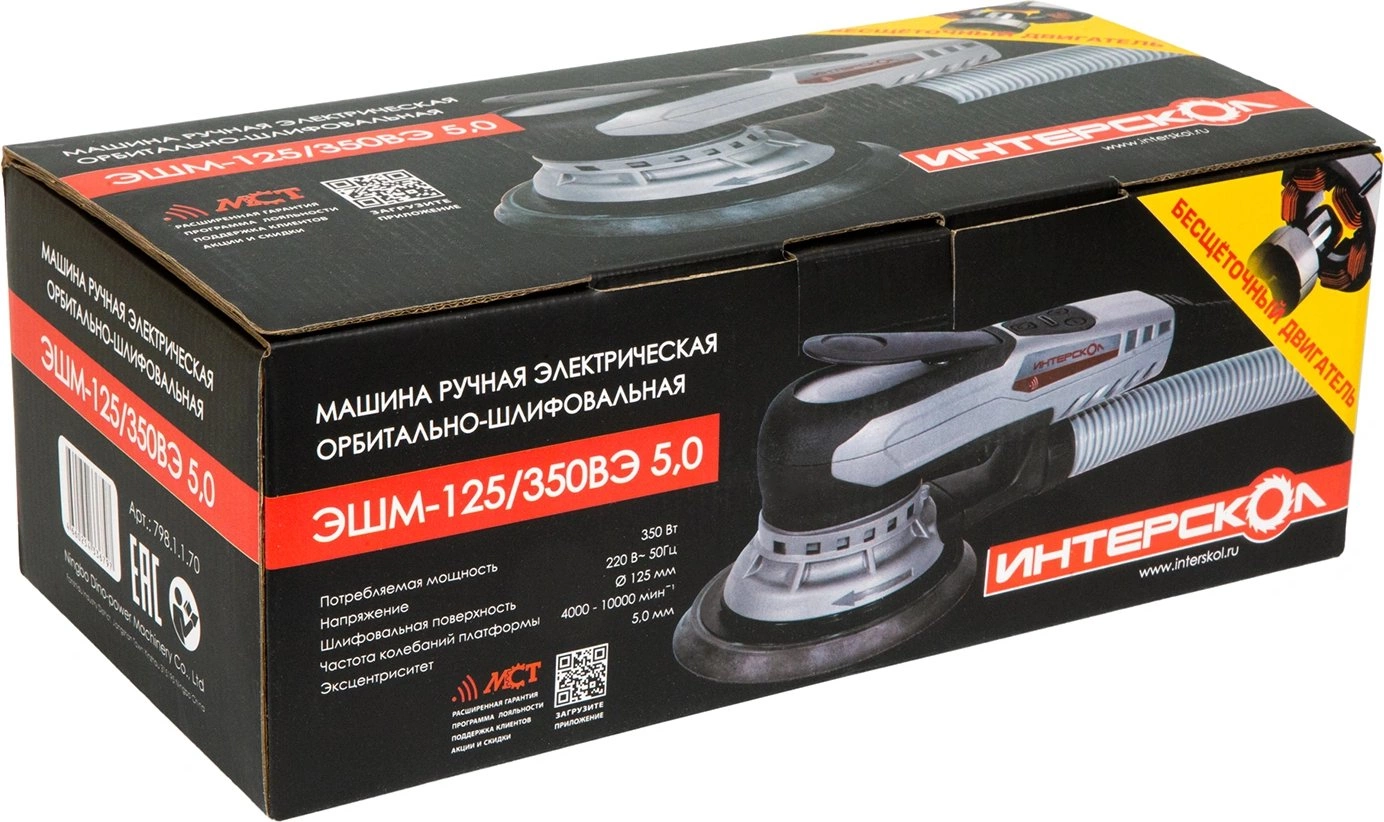 Машина эксцентриковая шлифовальная, пылеотводящий патрубок, шлифовальный материал – круг «абранет» с велкро - 2 шт., руководство по эксплуатации и безопасности, упаковка (картон).