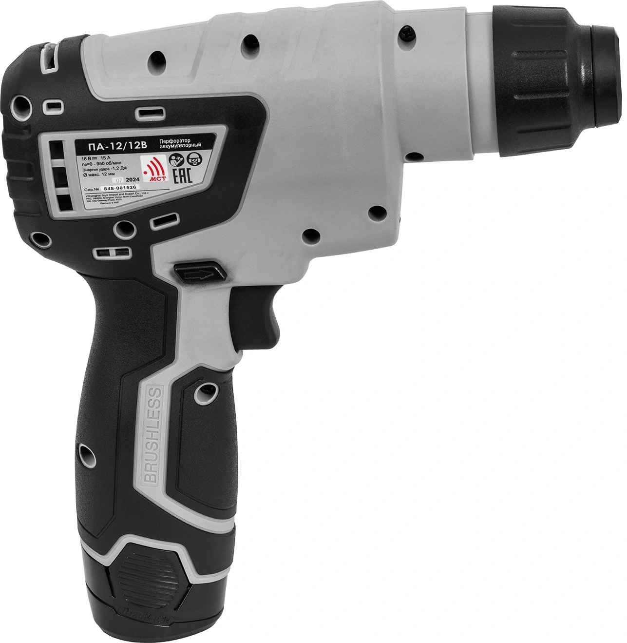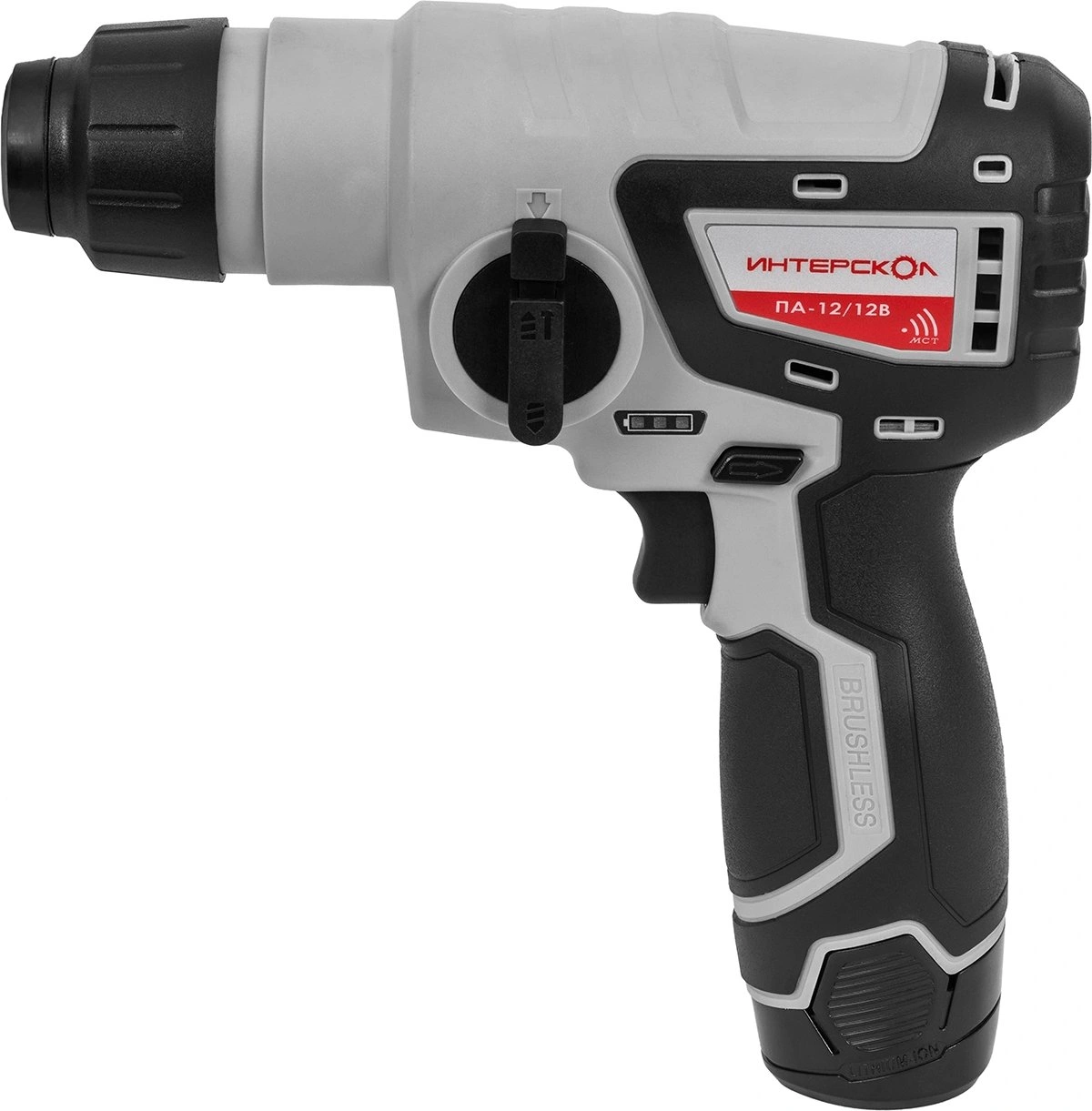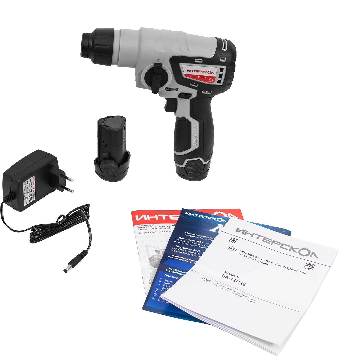 Аккумуляторный перфоратор, аккумуляторный блок БА-2/12 - 2 шт., зарядный блок ЗУ-2/12, картонная коробка, руководство по эксплуатации и инструкция по безопасности, гарантийный талон.