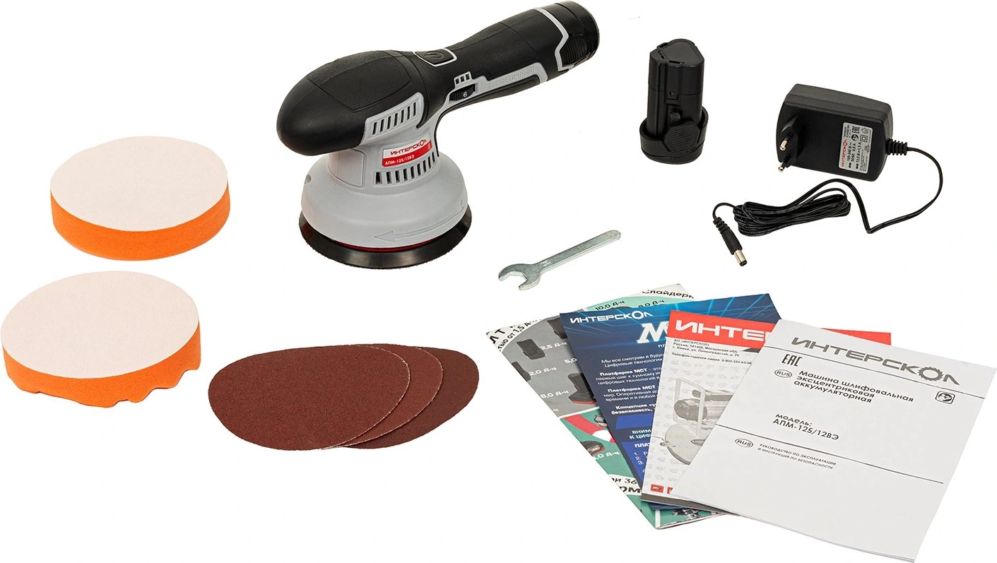 Аккумуляторная полировальная машина, аккумуляторный блок БА-2/12 - 2 шт., зарядный блок ЗУ-2/12, поролоновый полировальный диск с креплением velcro - 2 шт., шлифовальный лист с креплением velcro - 3 шт., ключ S14, упаковка, руководство по эксплуатации и инструкция по безопасности, гарантийный талон.