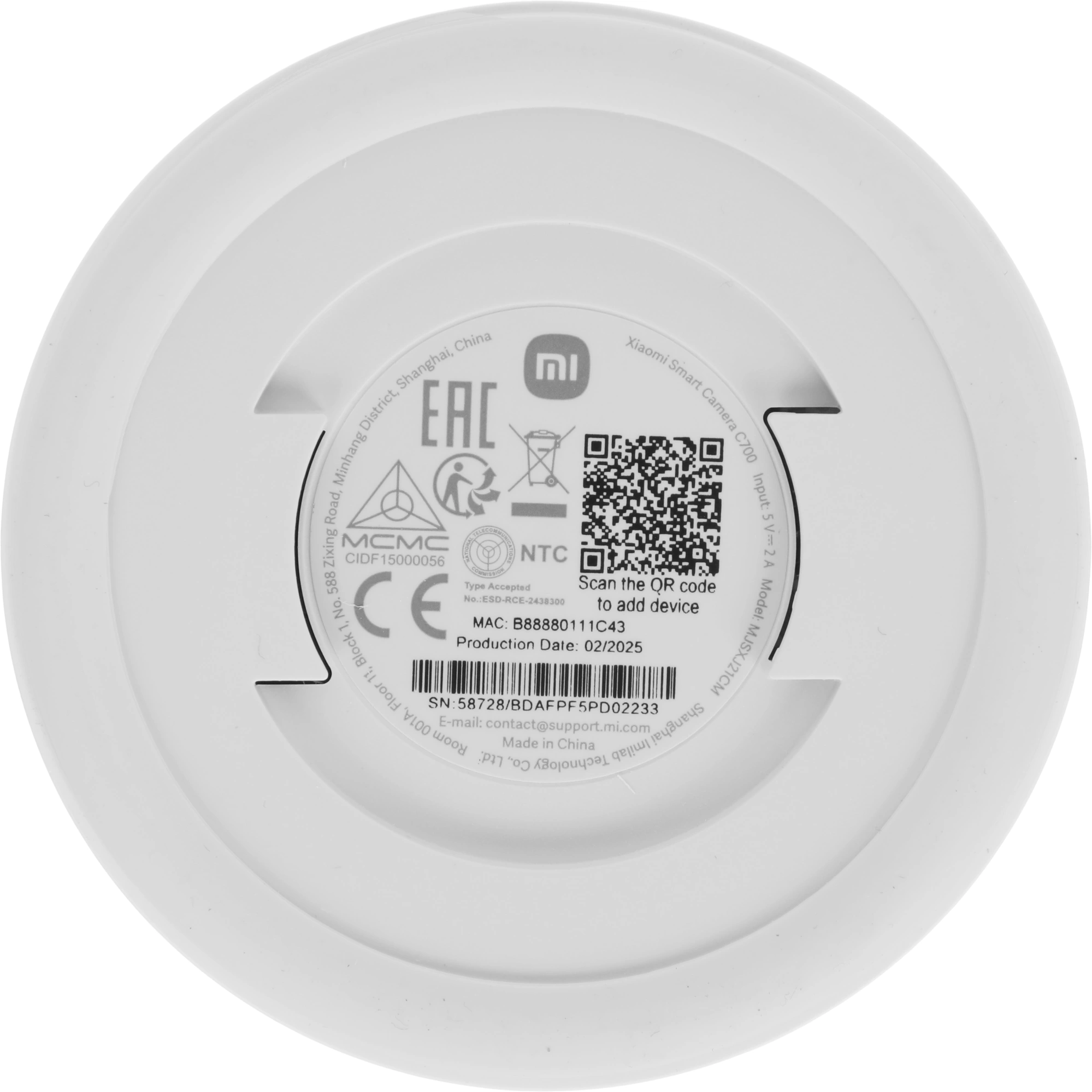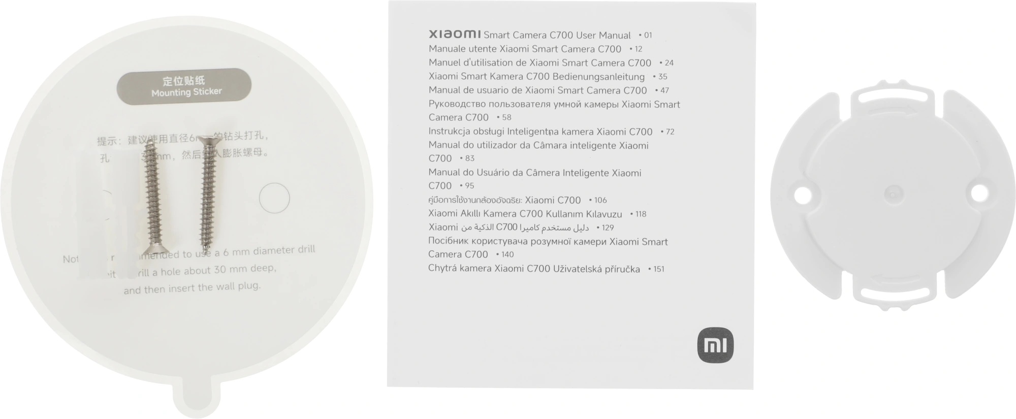 Xiaomi Smart Camera C700 EU 1 шт. Комплект для настенного монтажа (основание 1 шт., дюбель 2 шт., винт 2 шт.) Адаптер питания 1 шт. Зарядный кабель 1 шт. Монтажная наклейка 1 шт. Руководство пользователя 1 шт. Гарантийный талон 1 шт.