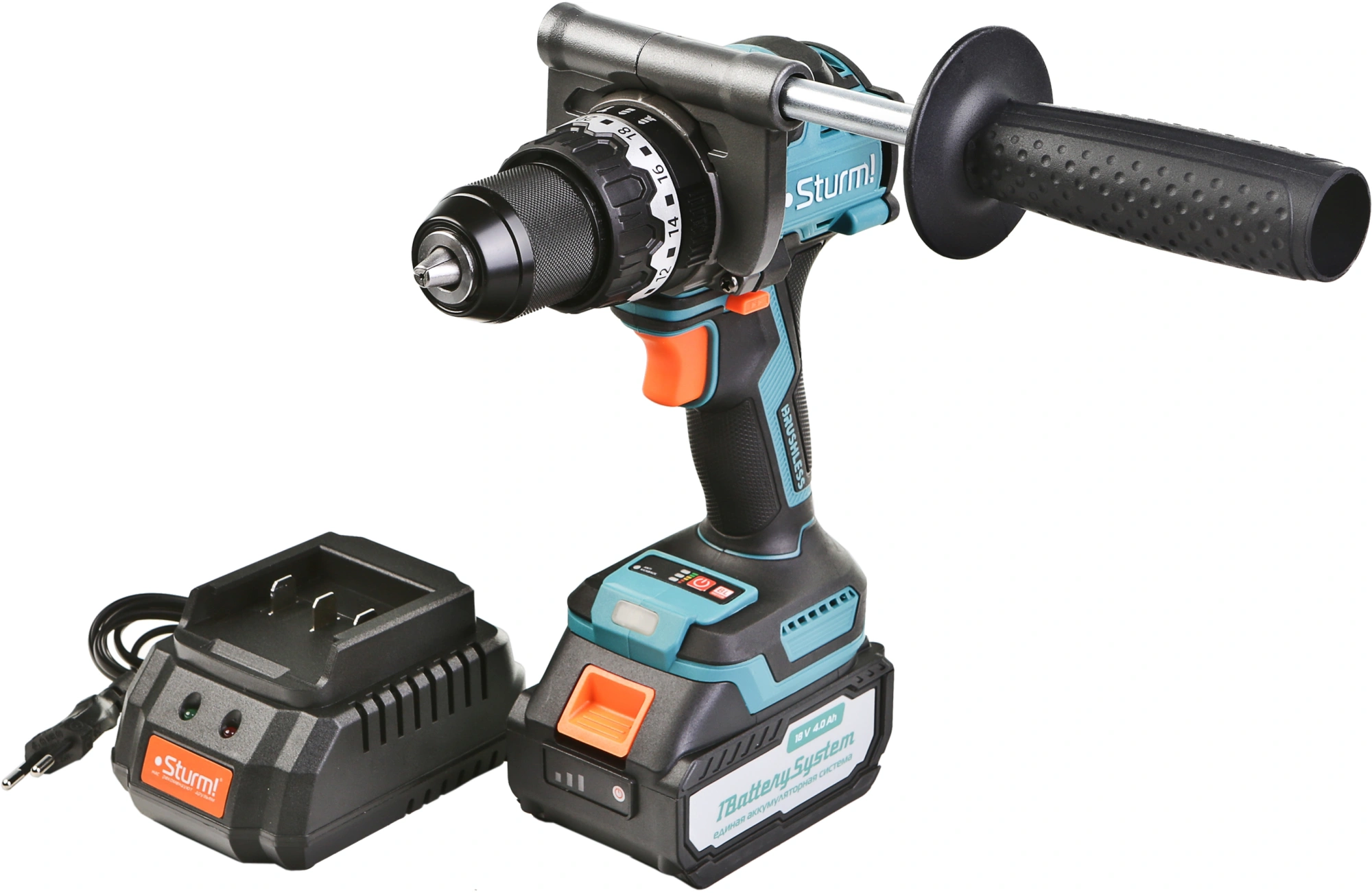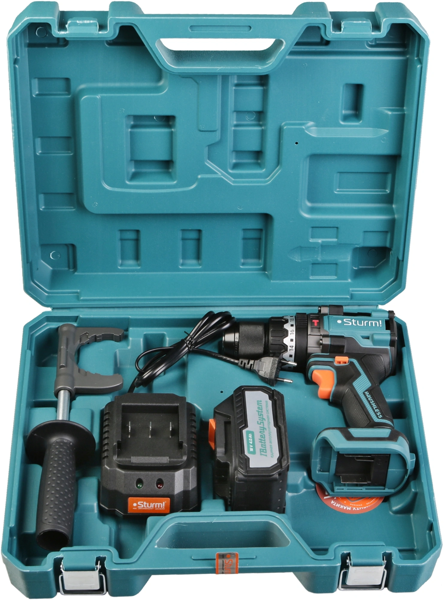 Дрель ударная, аккумуляторная батарея, зарядное устройство, вспомогательная рукоятка, инструкция по эксплуатации, инструкция по безопасности.
