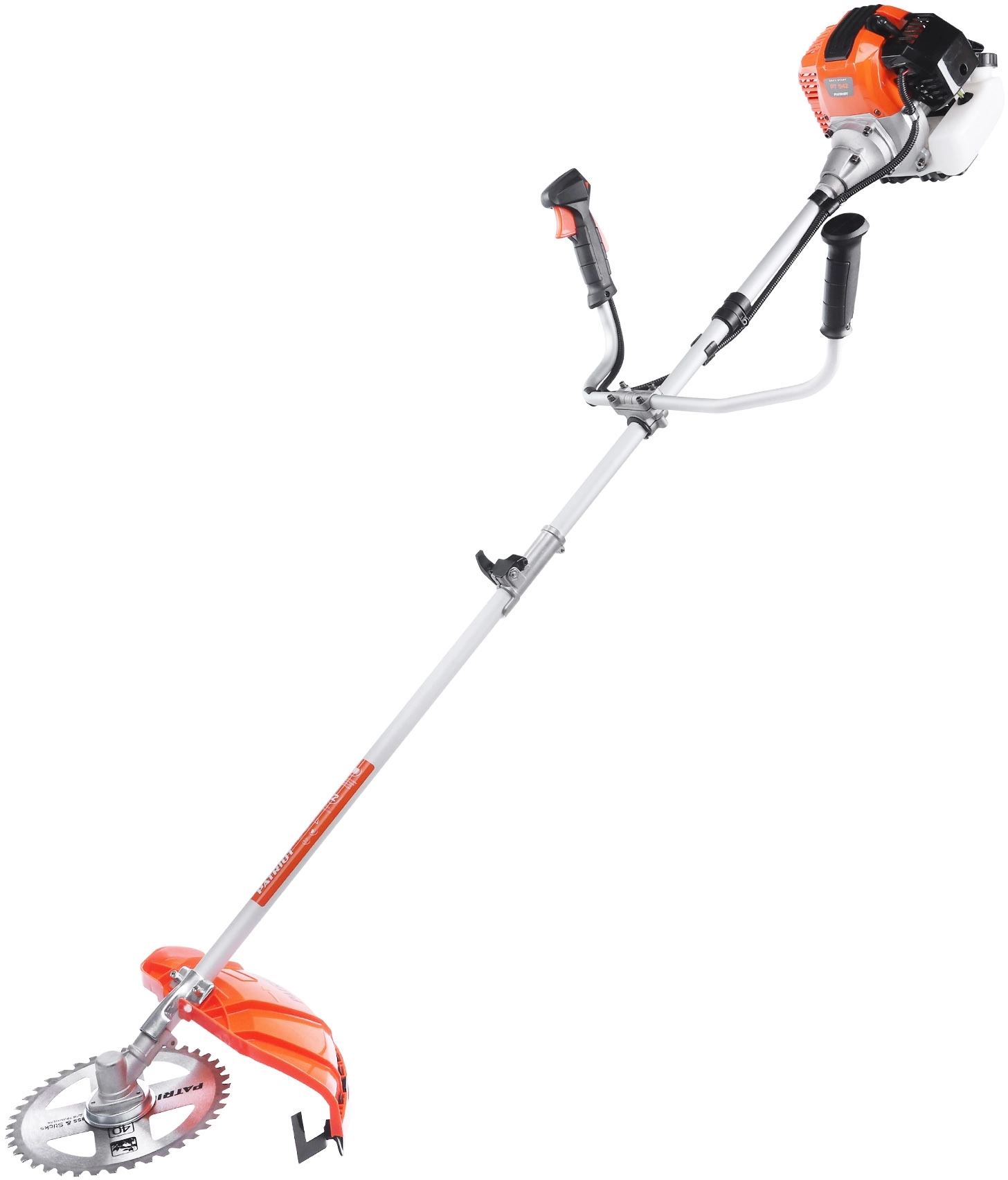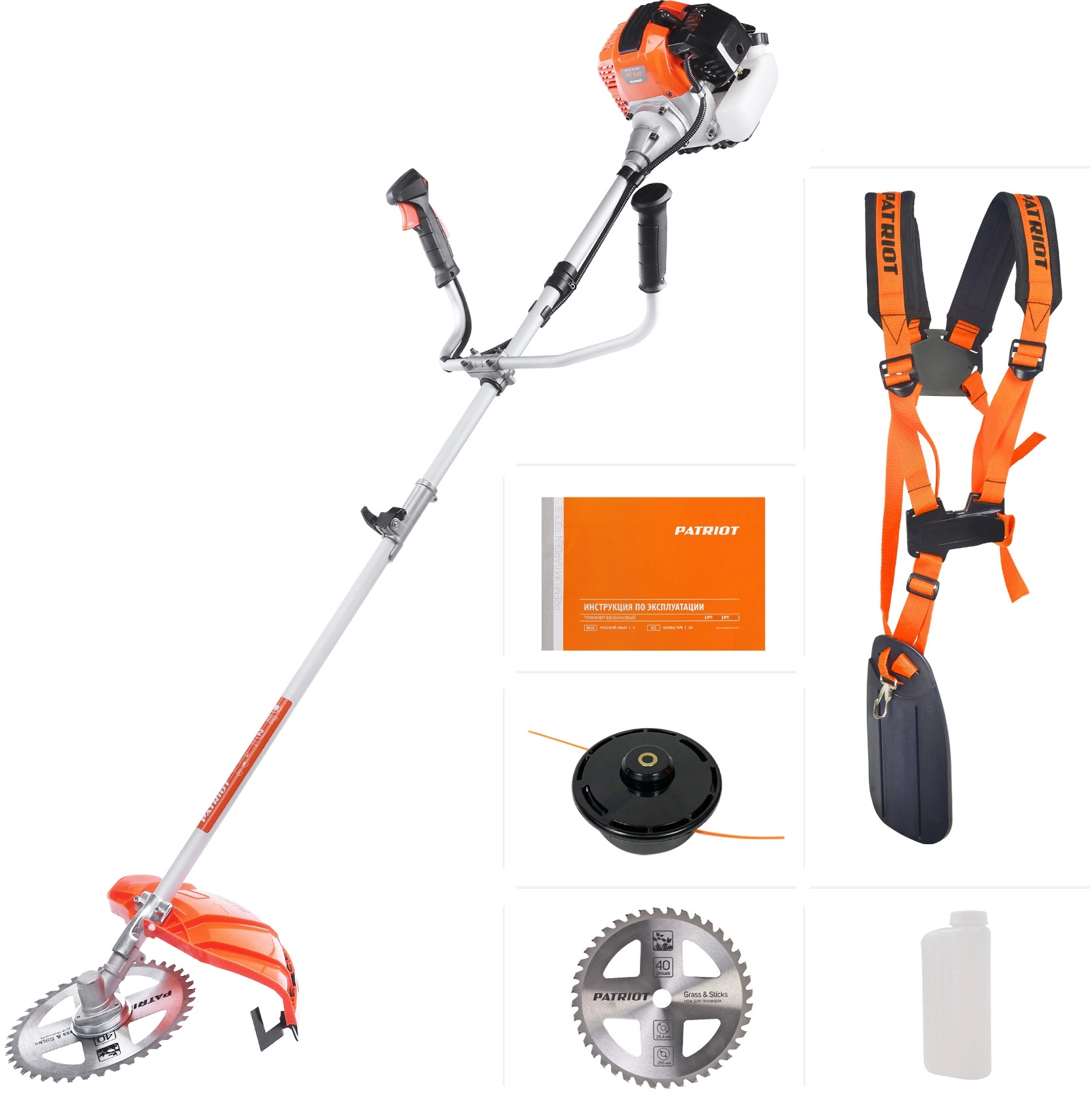 Двигатель в сборе, Трансмиссионный узел, Рукоятка левая, Разгрузочный ремень, Защитный кожух, Триммерная катушка, Металлический нож, Зип комплект, Канистра для приготовления топливной смеси, Инструкция