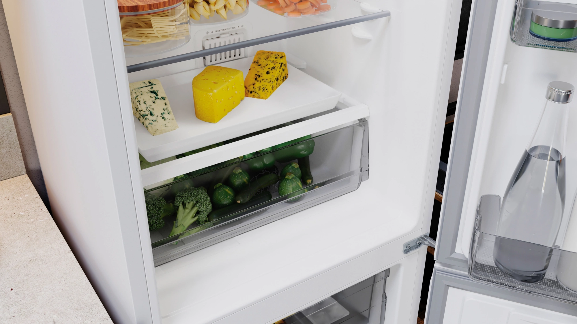Система охлаждения Total No Frost, эргономичная структура двери, защитный уплотнитель, ящик для овощей и фруктов, фронтальная ручка с накладкой, электронное управление (дисплей)