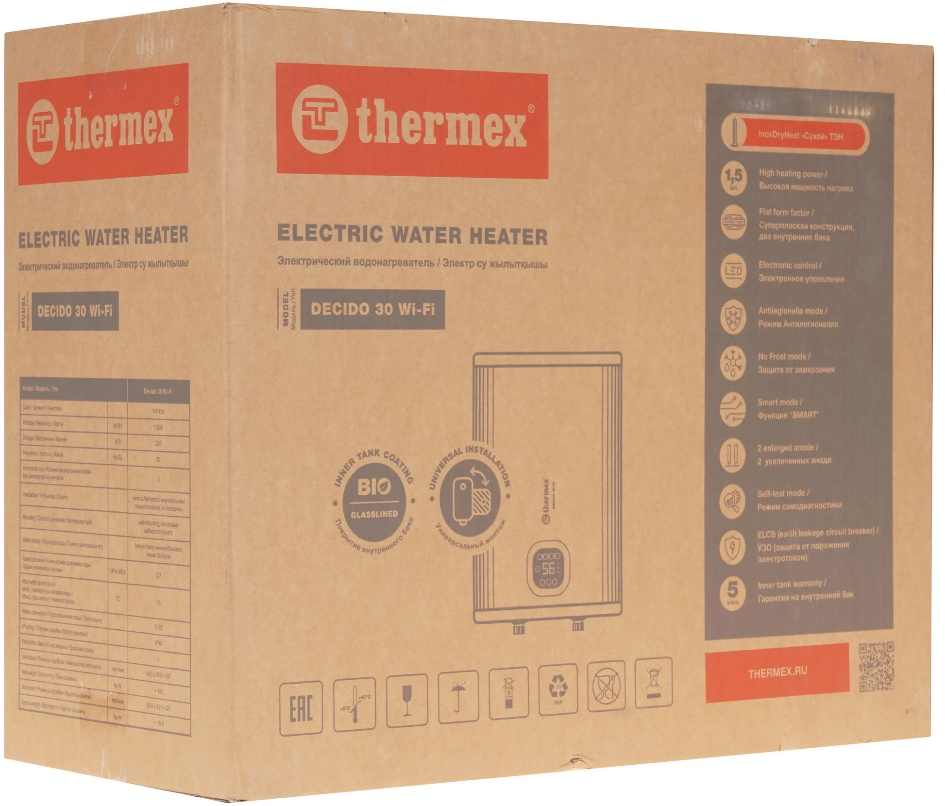 дисплей, регулировка температуры, самодиагностика, сухой ТЭН, термометр, управление c мобильного приложения по Wi-Fi