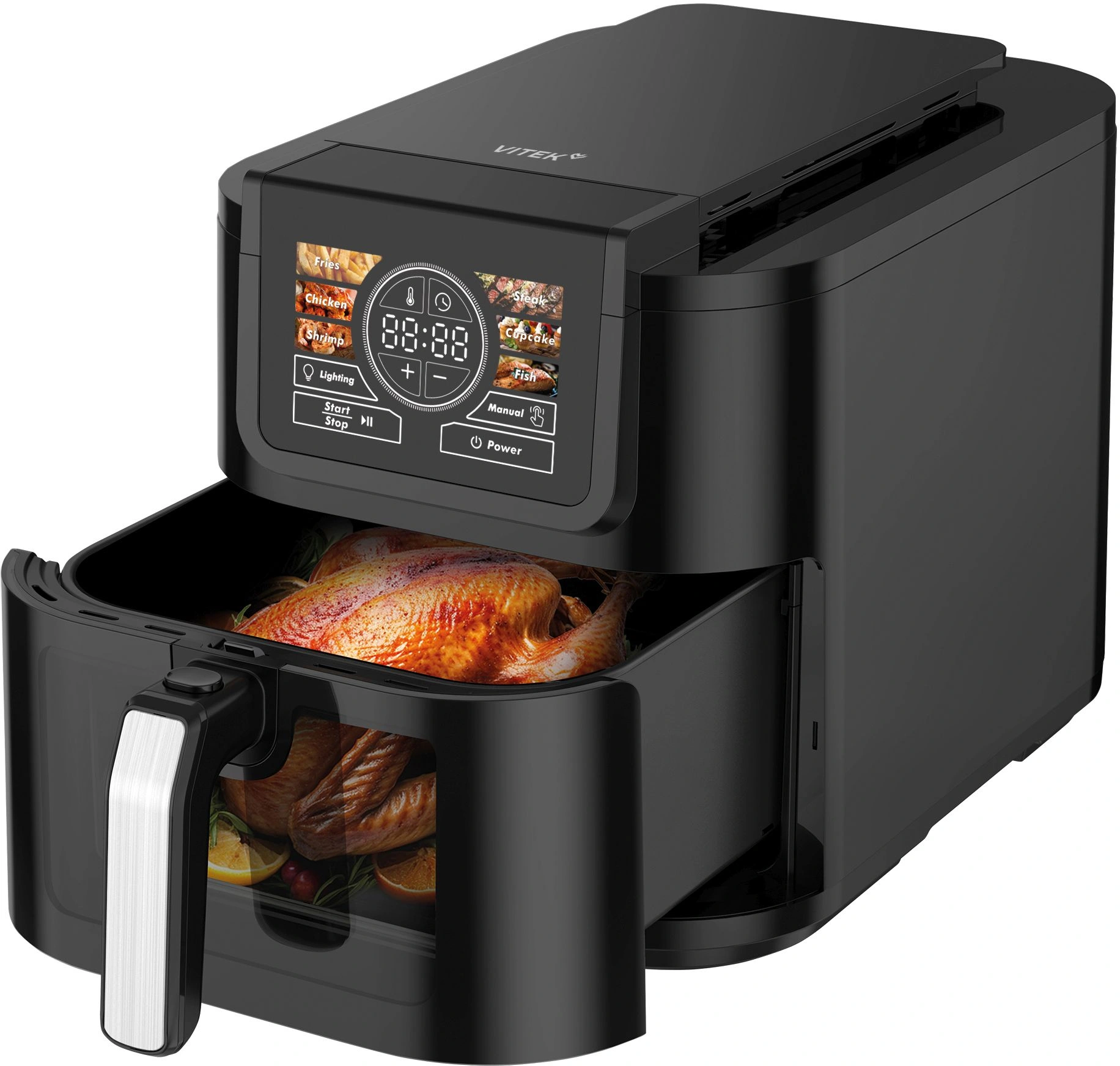 Аэрогриль позволяет готовить с минимальным количеством масла или совсем без него. Блюда будут более полезными, с хрустящей корочкой снаружи и нежная внутри. Окошко и подсветка для визуального контроля без открытия камеры.